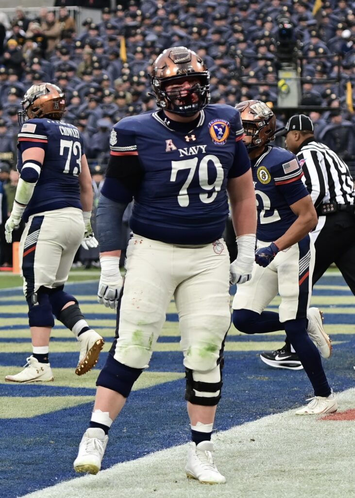 Navy’s Hoke Smith II (#79) cheers with the crowd.