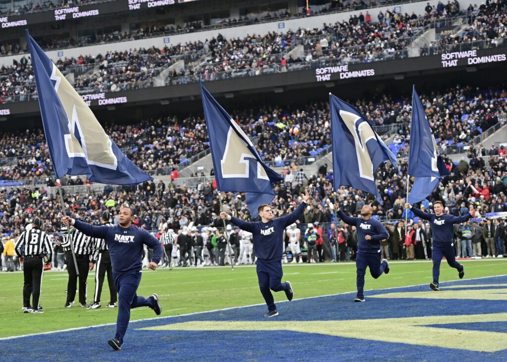 Navy’s Cheer Team runs the flags across the end zone to celebrate.