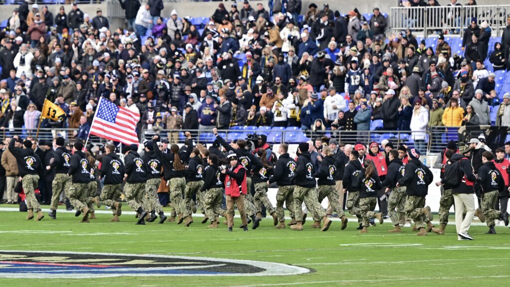 Members of Navy’s 13th company Ball Run team bring the game ball onto the field.