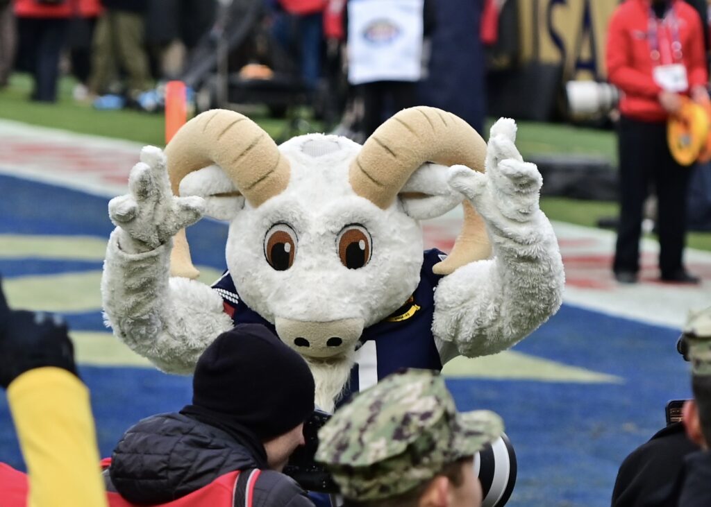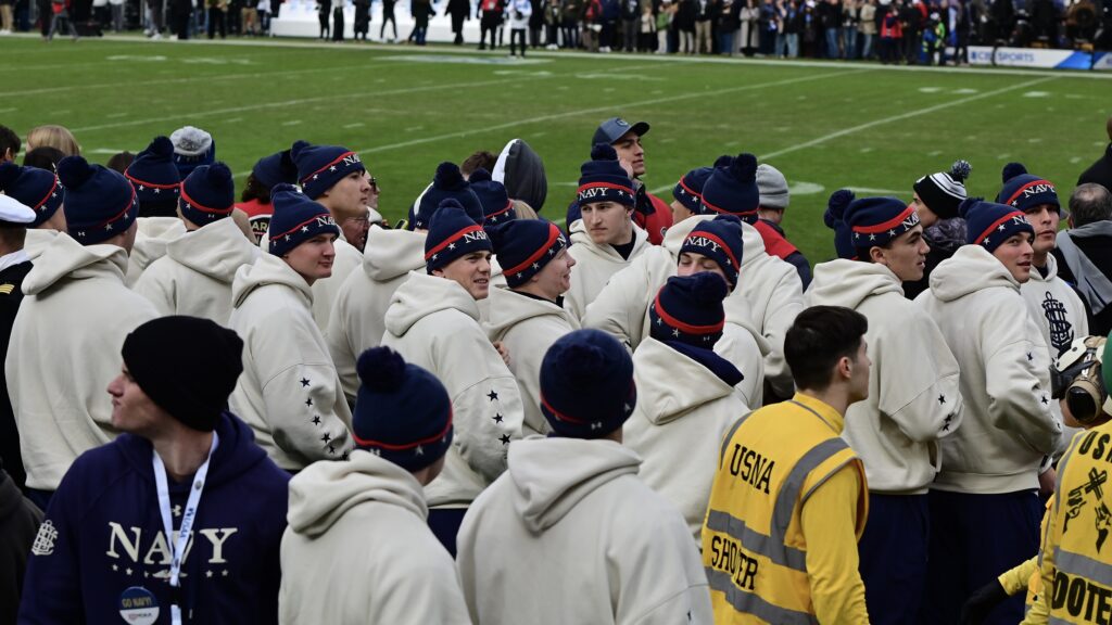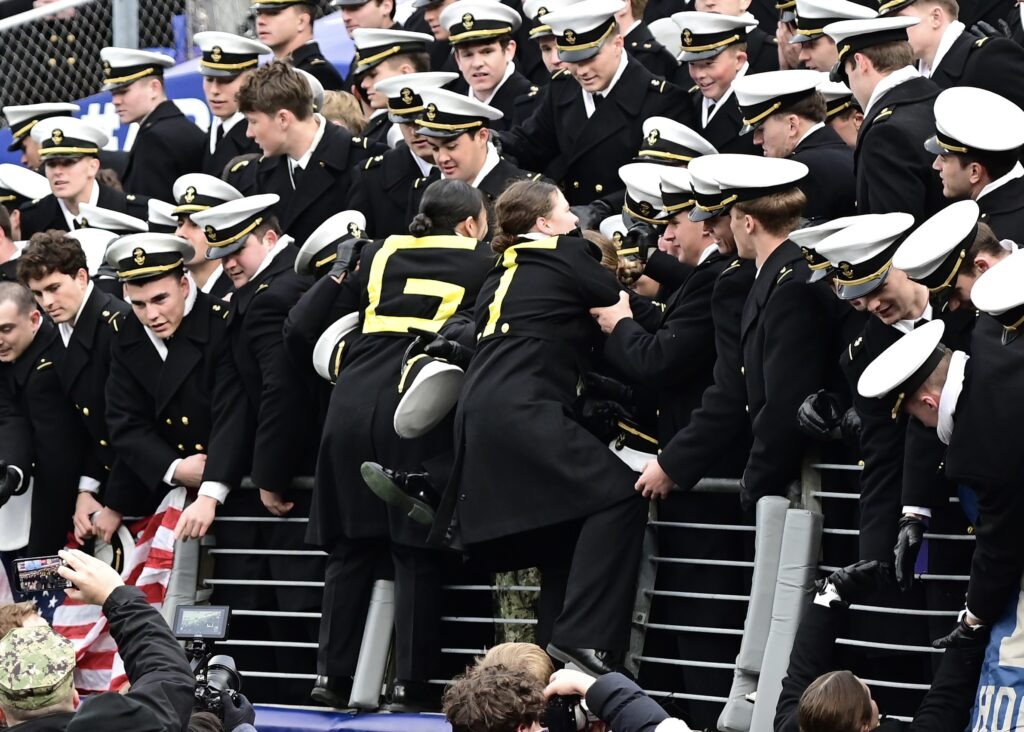Navy’s exchange Midshipmen climb up to join the brigade for the game.