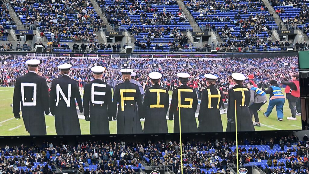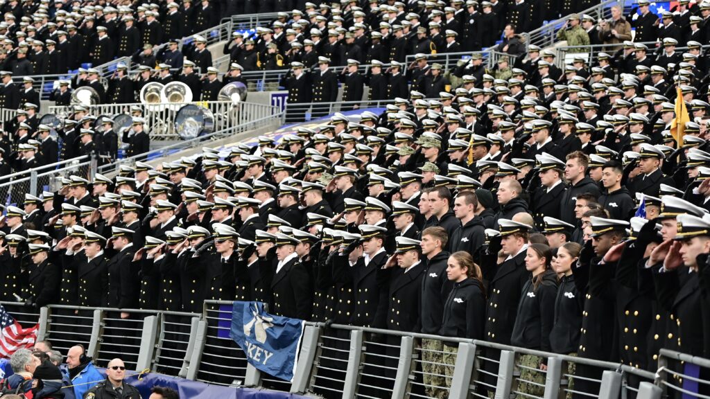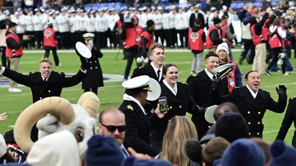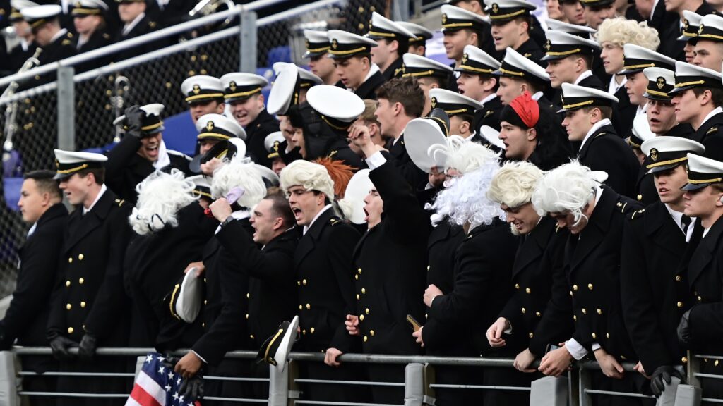 Navy’s exchange Midshipmen are released to cheer with their fellow members of the brigade during the game.