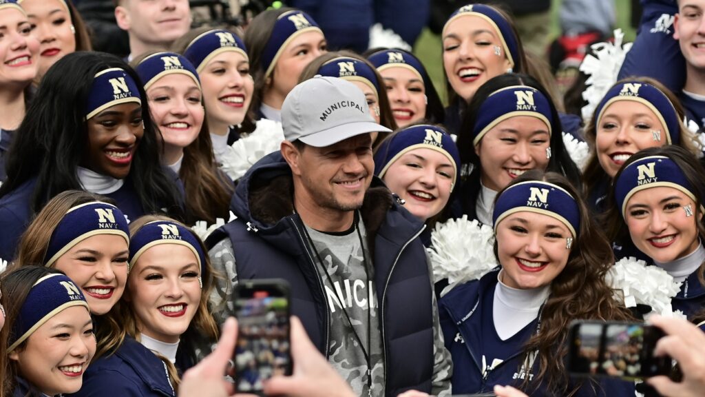 Mark Wahlberg poses on the sideline with members of the Navy Cheer team ahead of the Army/Navy game.