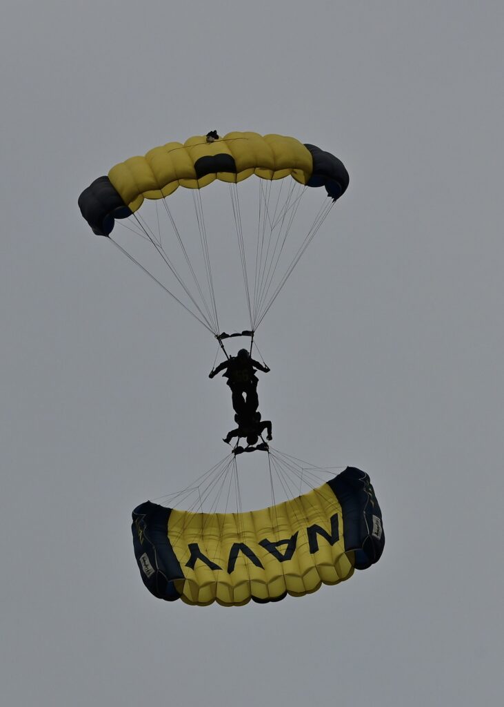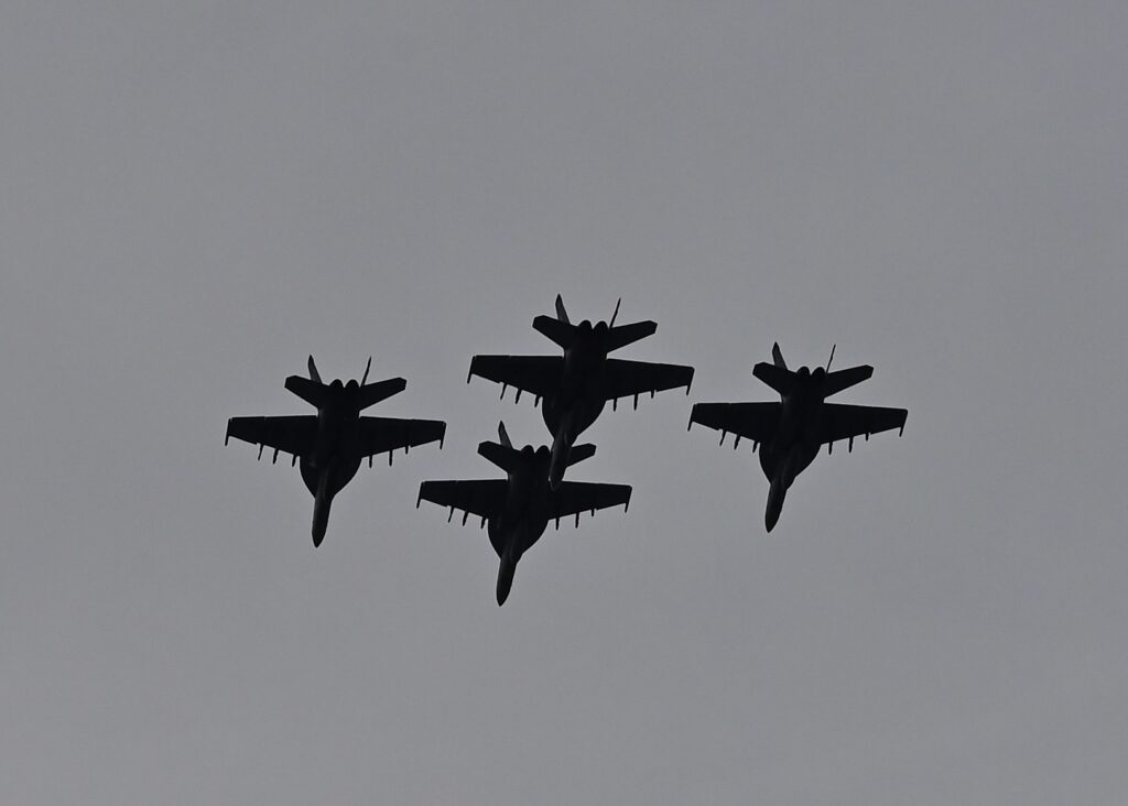 Navy’s flyover featured 4 F/A-18E Super Hornets from the “Rampagers” of VFA-83, based out of NAS Oceania, Virginia. Piloting the lead aircraft and the Commanding Officer is Cmdr. Jaime “Eeyore” Moreno, USNA Class of 2007. The wine aircraft is piloted by Lt.Cmdr. Robert “Fat Goose” Nelson, USNA Class of 2012. Dash Three is piloted by Lt. Cmdr. Mike “Dirty Mike” Buck, USNA Class of 2014. Piloting the Dash Four aircraft is Lt. Cmdr. Ryan “Jeeves” Thurman, USNA Class of 2014. Providing ground control and support was Lt. Cmdr. James “Trash Panda” Mackovjak from the Class of 2014.