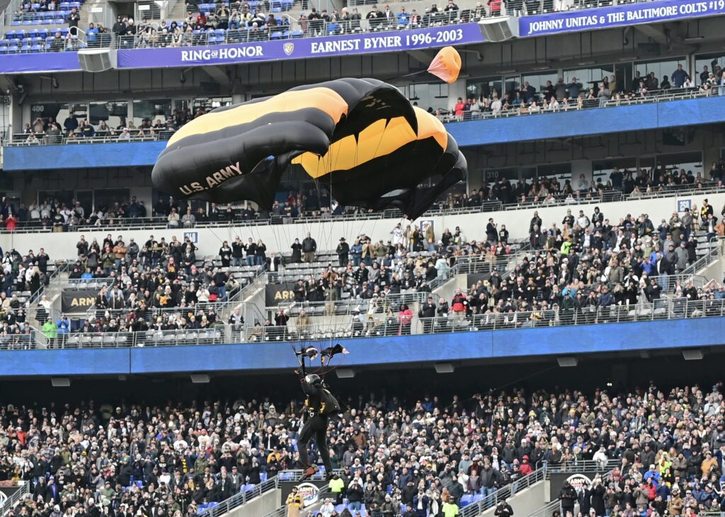 Members of the Army Golden Knights parachute team jump into the stadium.
