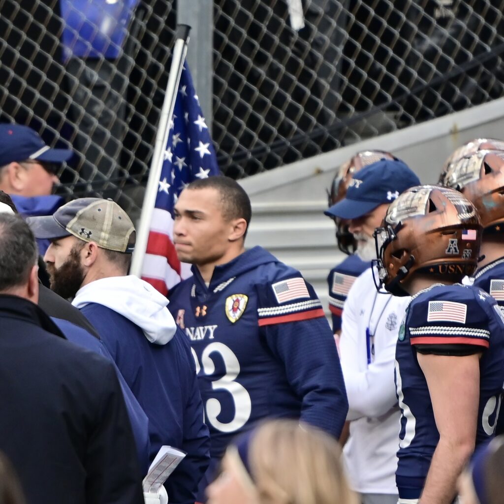 Navy Senior Cody Howard, #83, TE from North Beach MD carried the American flag ahead of the Midshipmen taking the field.