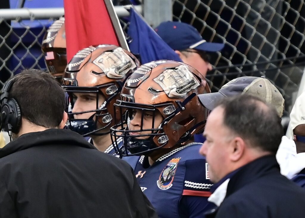 Navy’s team captains, #11 Blake Horvath and #96 Landon Robinson, prepare to take the field.