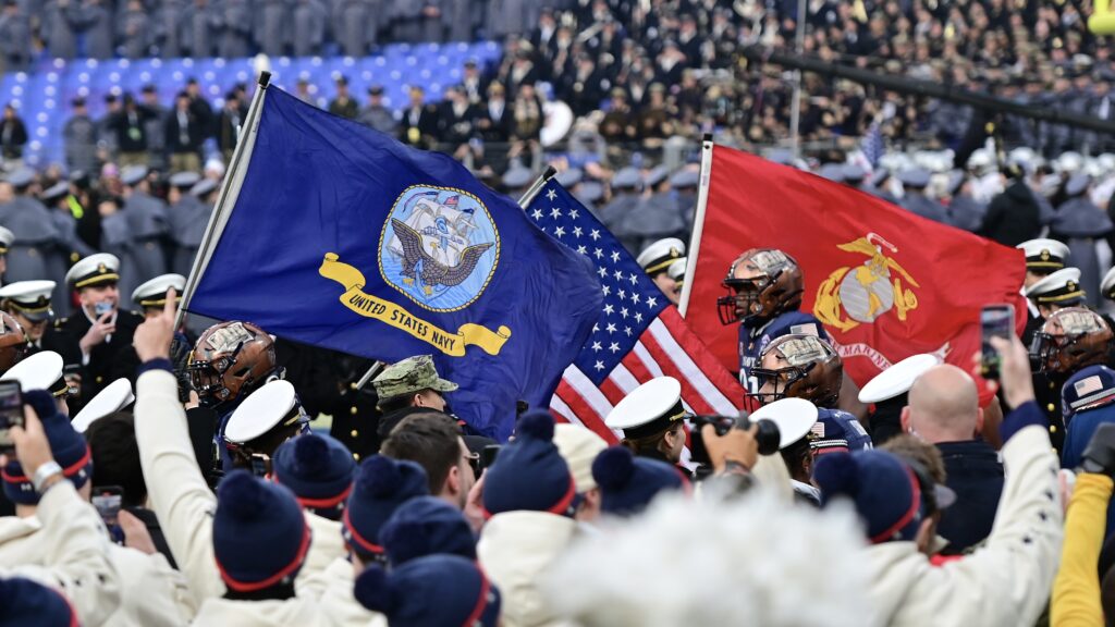 Army’s cheer team runs the flags to lead the Black Knights onto the field.