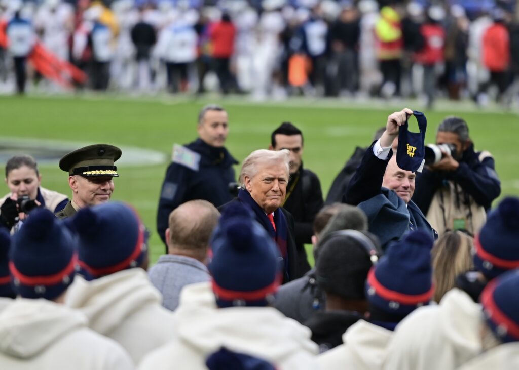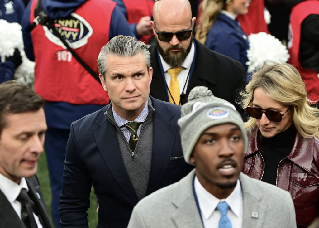 Secretary of Defense Pete Hegseth leaves the field before the game begins.