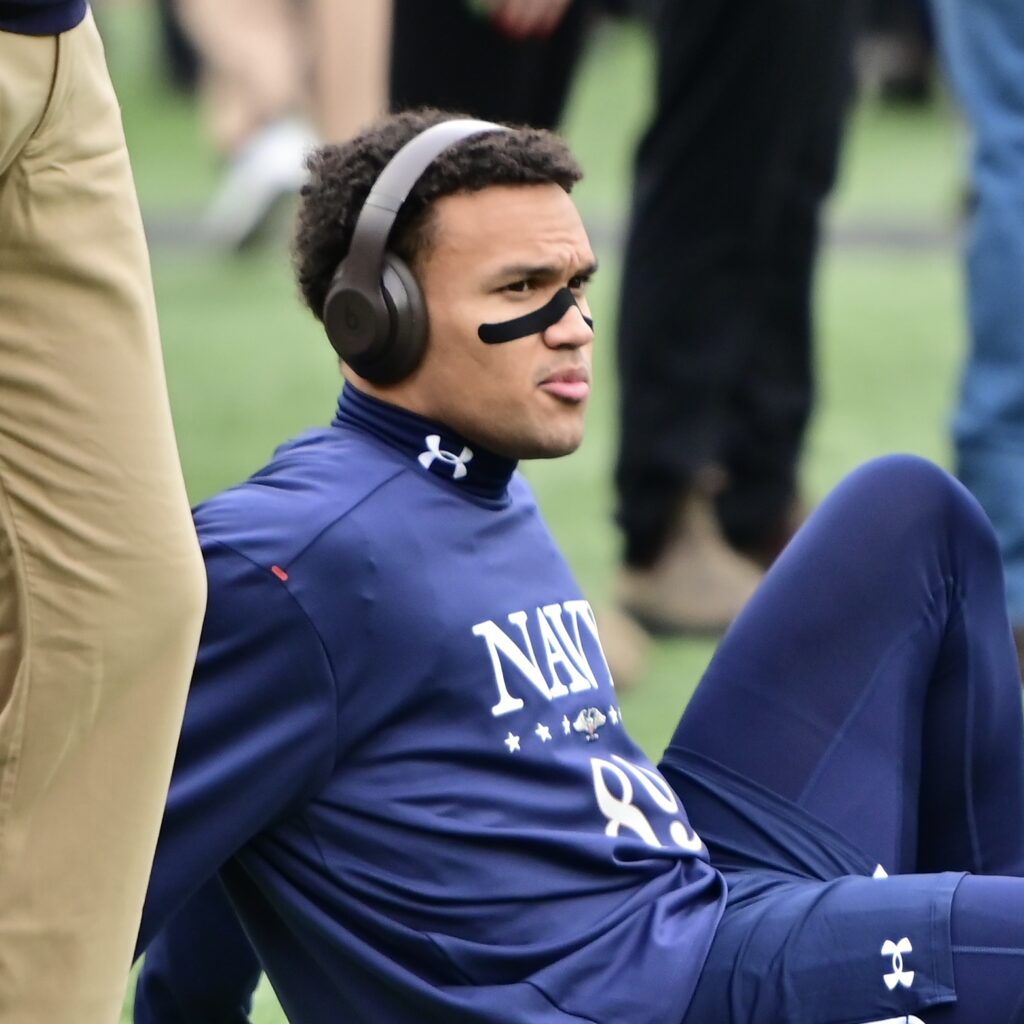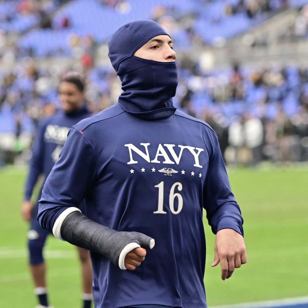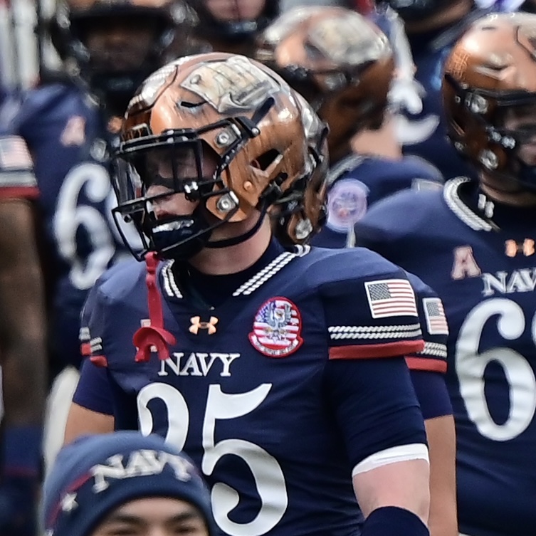 Navy Senior Luke Pirris, #35, OLB from Porte Verda Beach FL wears the patch of FLEET SUPPORT UNIT…