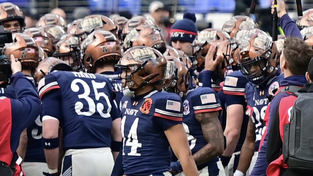 Navy has a quick huddle before heading to the locker room before the game begins.
