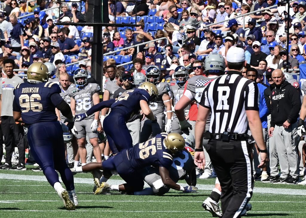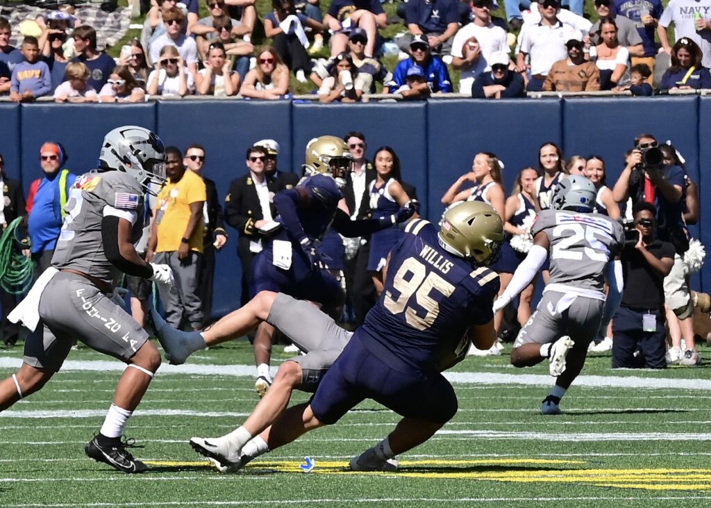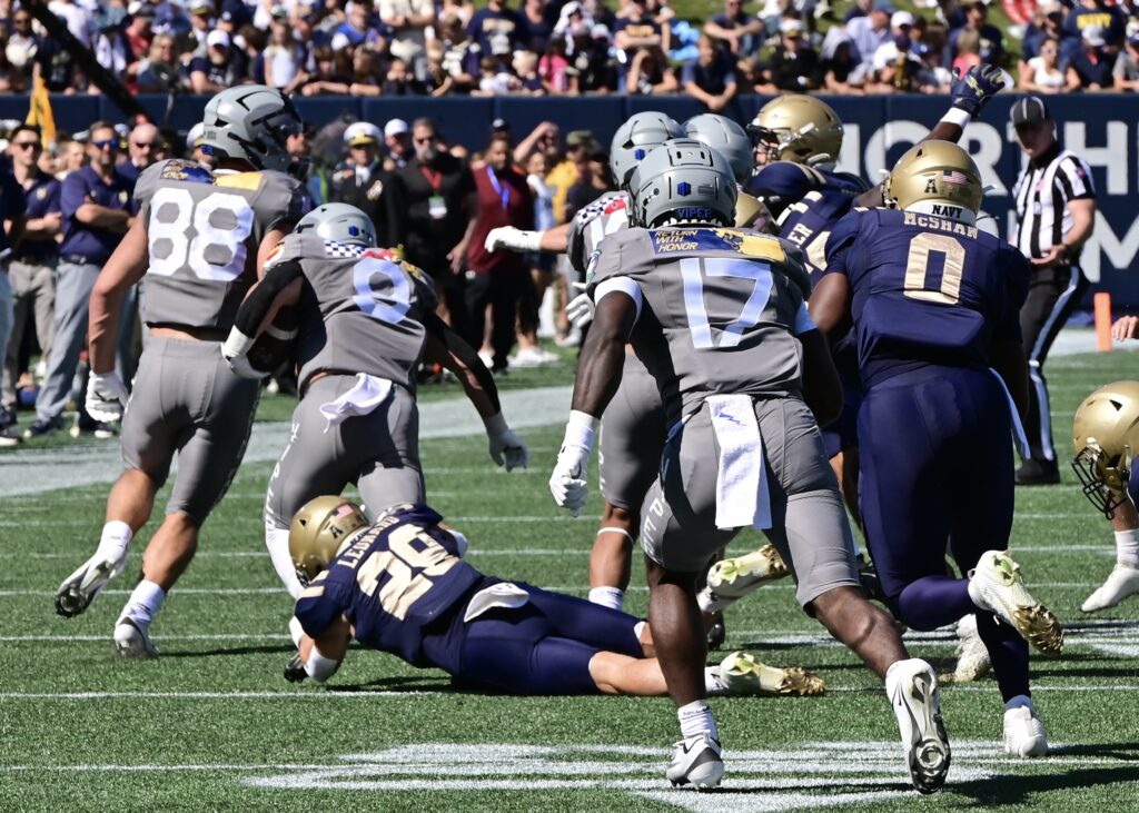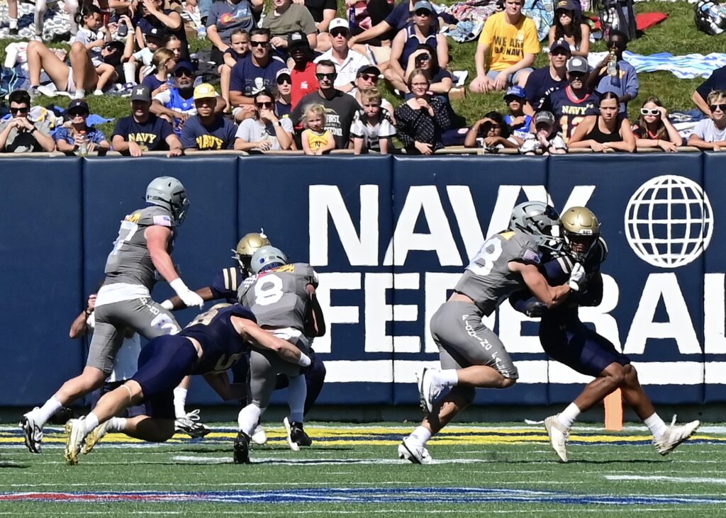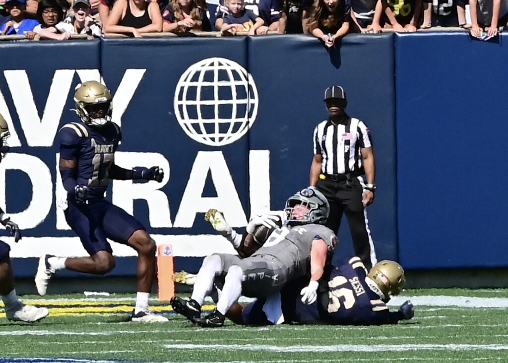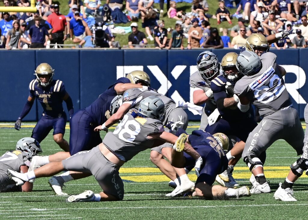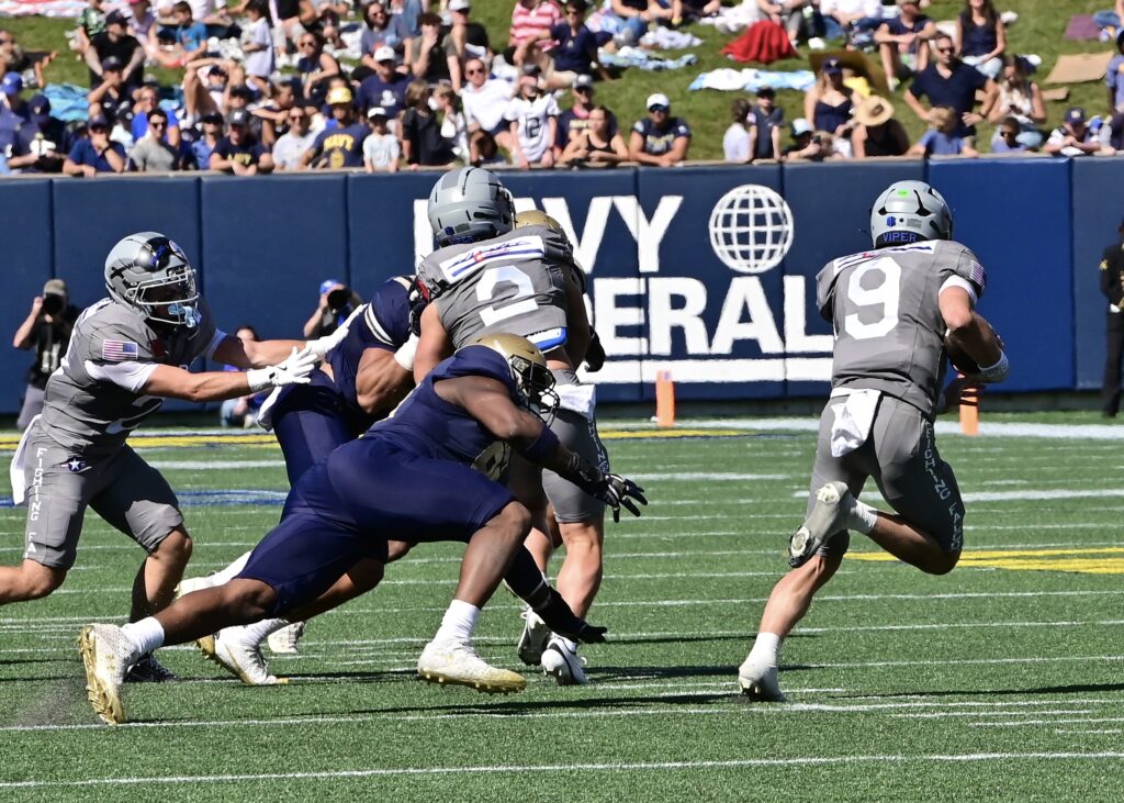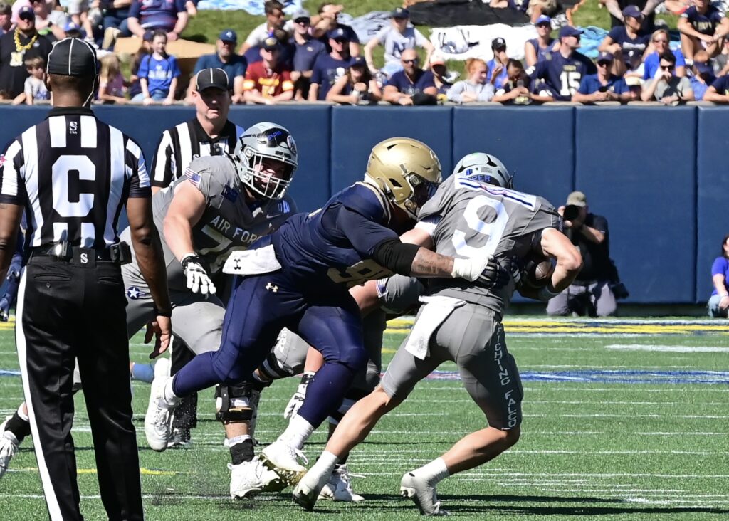 Air Force #9 (Liam Szarka) rushes right for a 1 yard loss when he’s wrapped up by Navy’s Luke Pirris (#35) and Griffen Willis (#95).