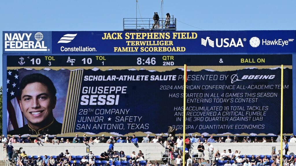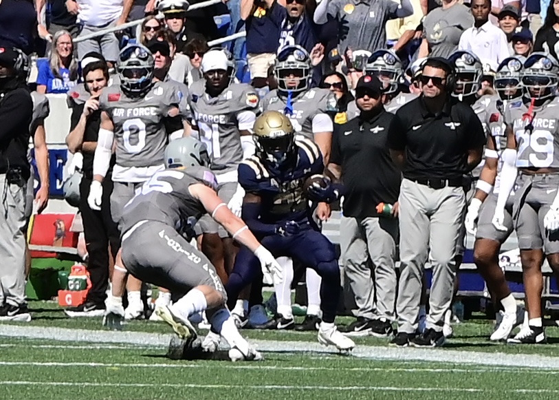 Air Force #8 (Kade Frew) rushes right but he’s stopped for zero yards by Navy’s Giuseppi Sessi (#16), forcing a 4th and 4 situation.