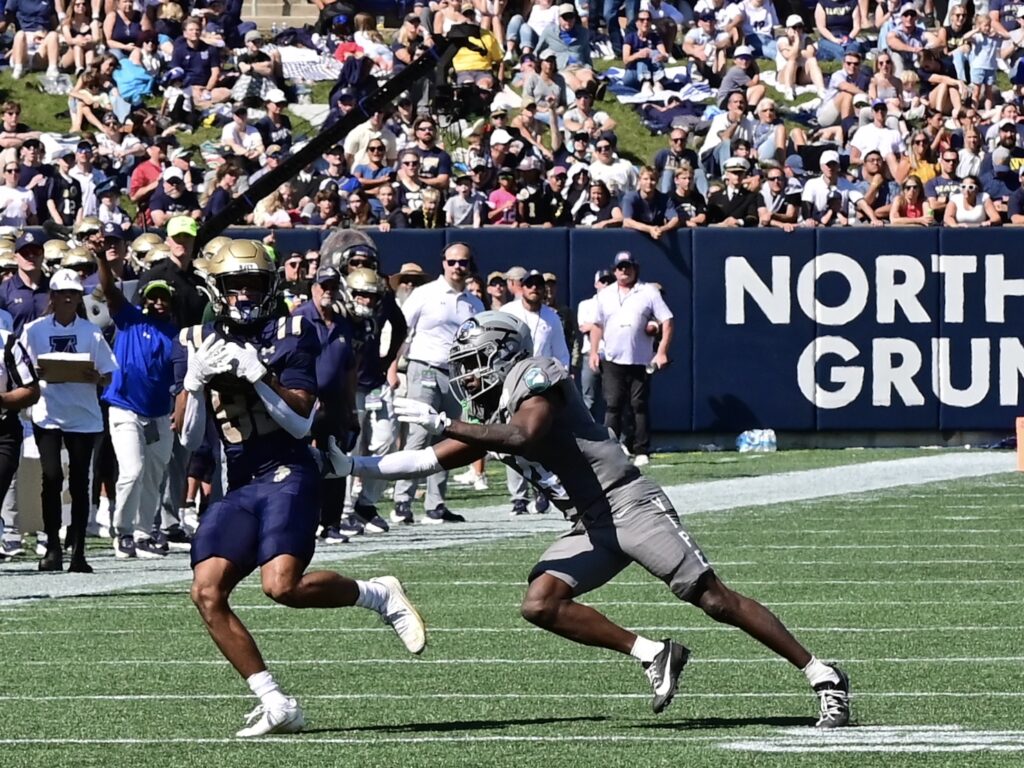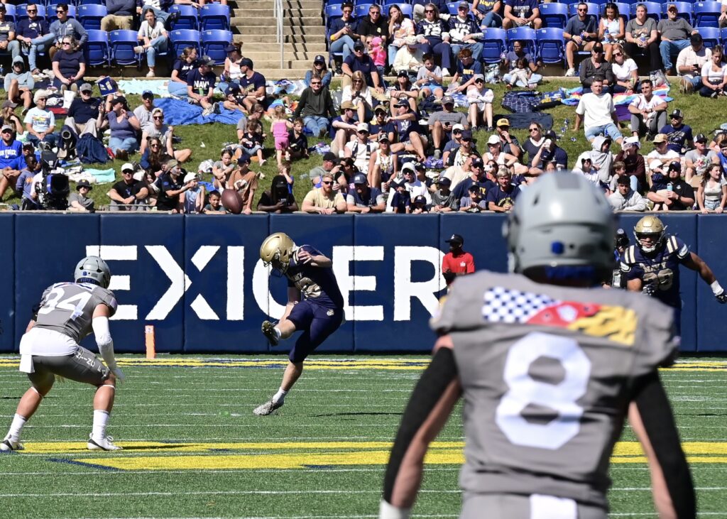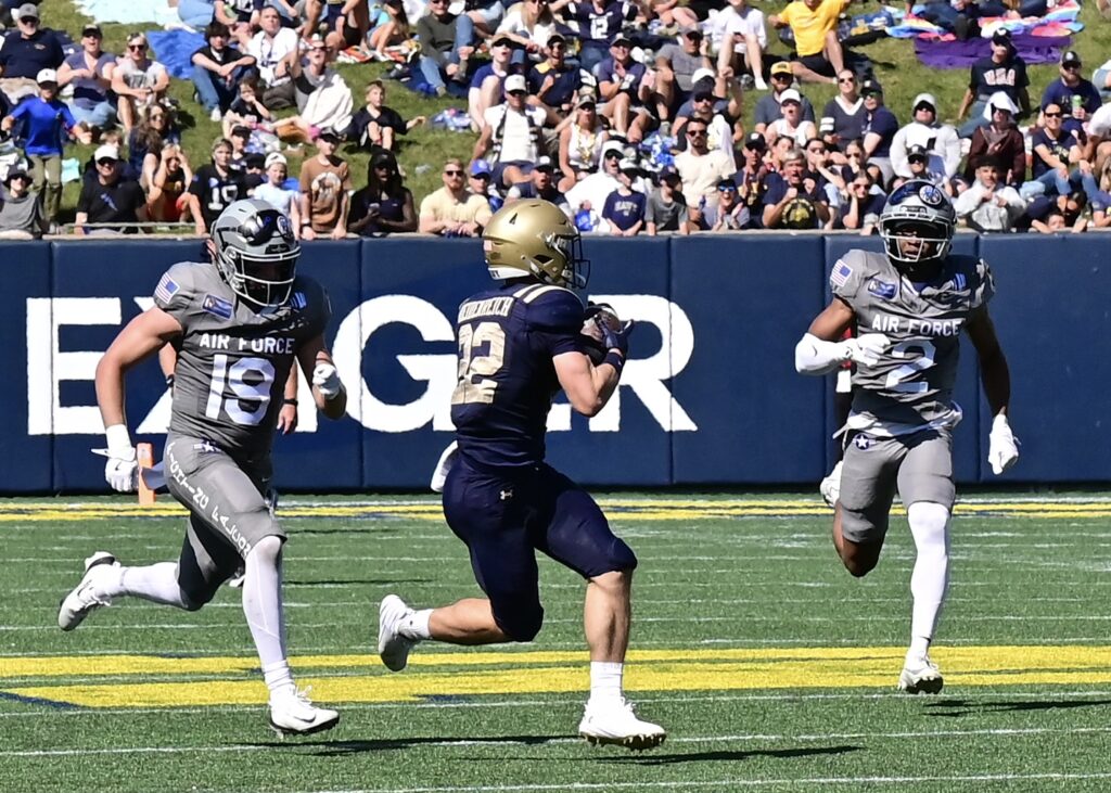 Navy’s pass is complete, deep right, to Nathan Kent (#82) for 36 yards to the USAFA22.