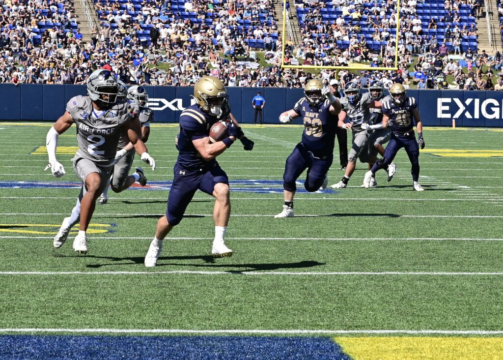 Air Force #9 (Liam Szarka) is chased down by Navy’s Julien Moutome (#90) and stopped after 7 yards at the USAFA36.