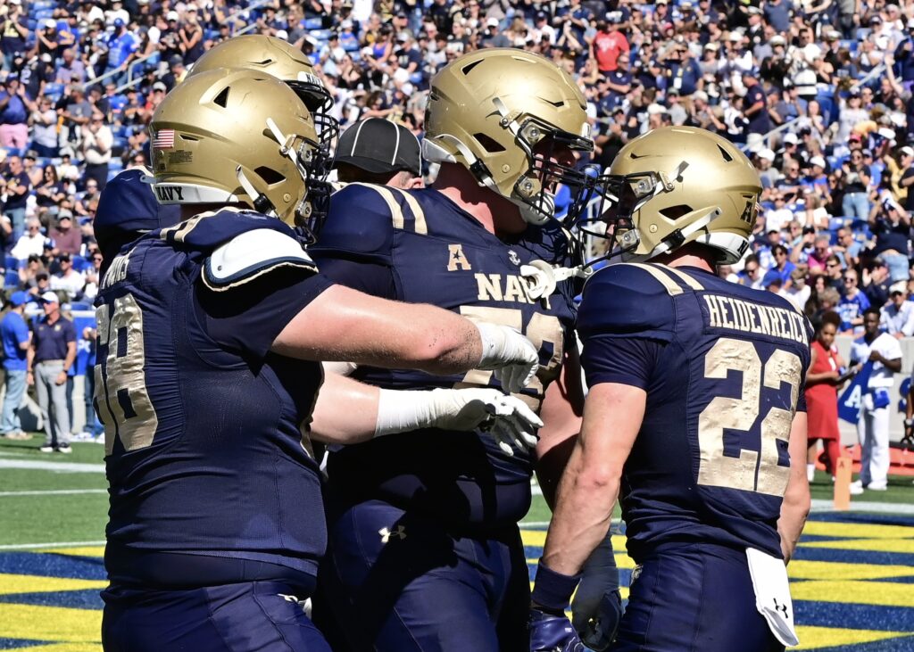 Navy’s Eli Heidenreich (#22) celebrates the score with his O-Line.