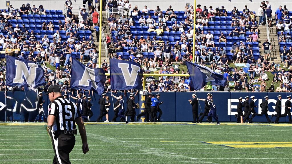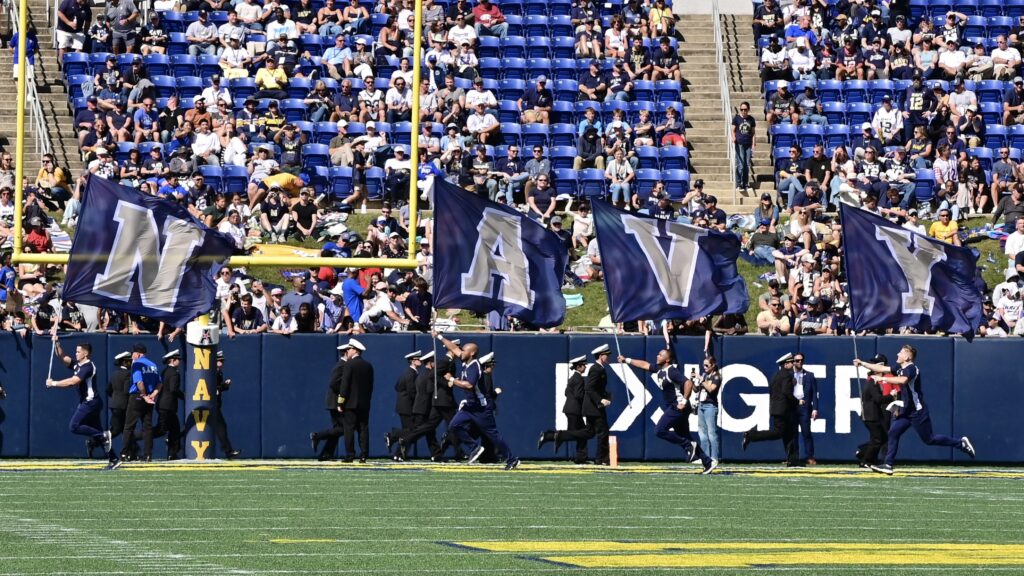 Navy’s Cheer team runs the flags across the North end zone as the Brigade runs to do their pushups.