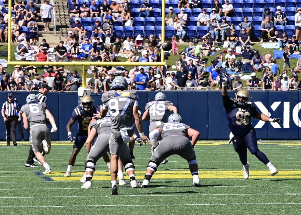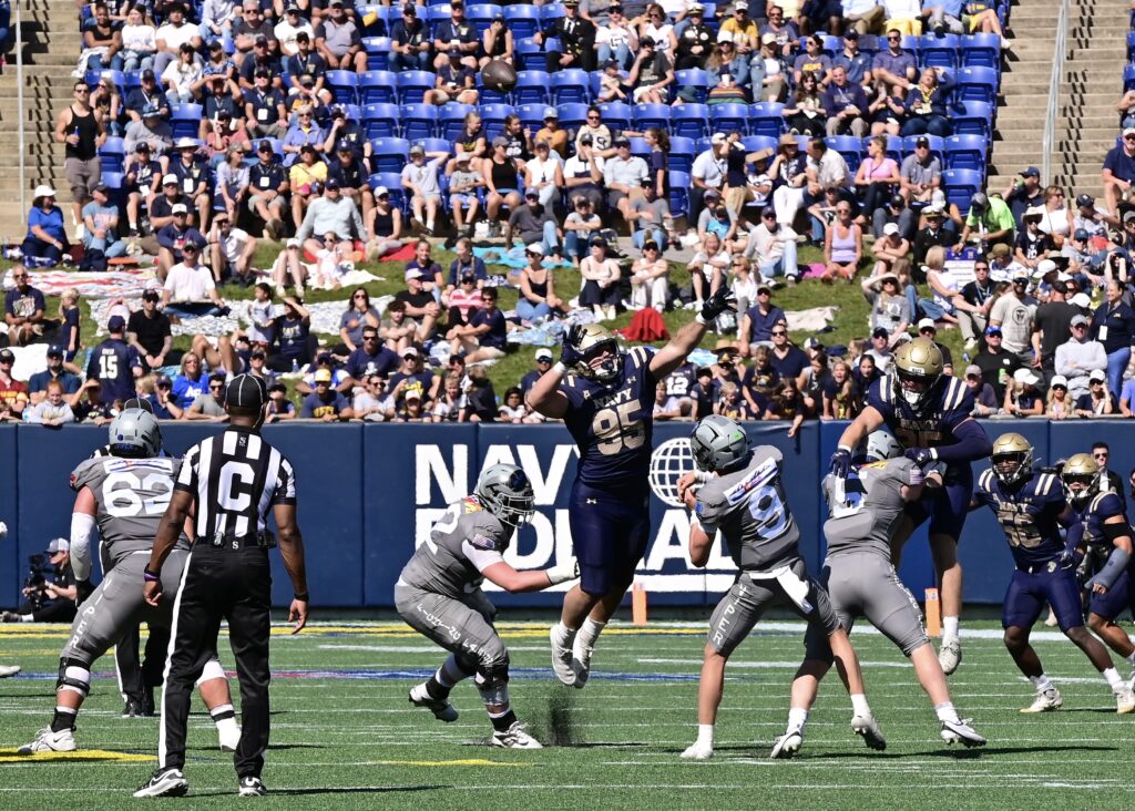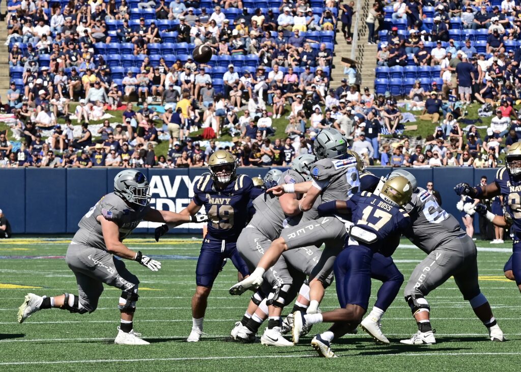 Air Force pass by #9 (Liam Szarka) falls incomplete, deep middle, when faced with a QB hurry by Navy’s Griffen Willis (#95).