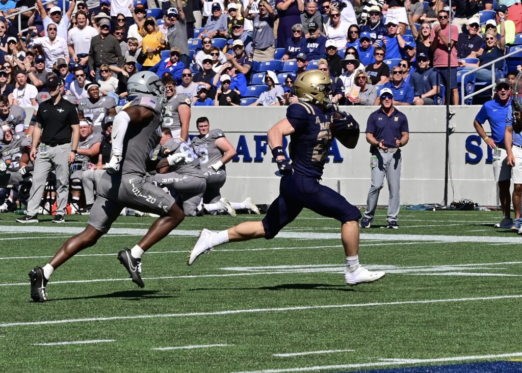 Navy’s Eli Heidenreich (#22) turns on the jets and flies downfield 80 yards for the touchdown. Clock 04:02.