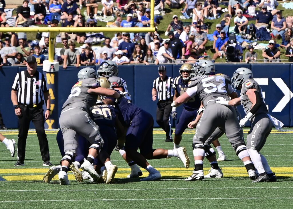 Air Force #9 (Liam Szarka) rushes up the middle for no gain when he’s tackled by Navy’s Luke Pirris (#35) and Griffen Willis (#95).
