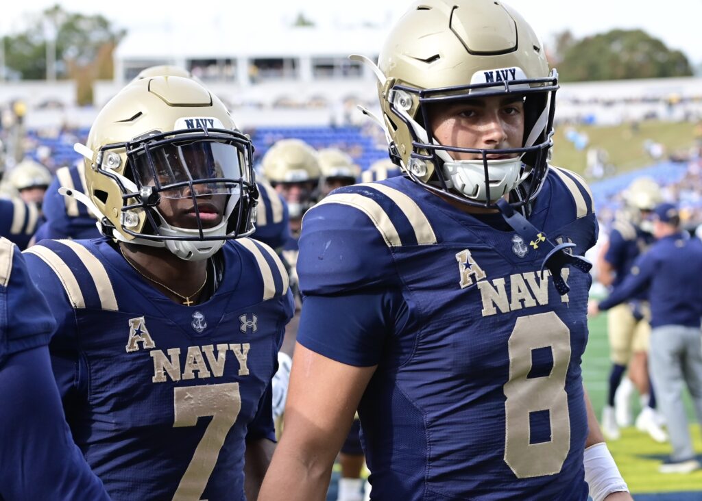 Navy junior Kush’I Abraham, #7, S from Cincinnati OH and sophomore Jackson Gutierrez, #8, QB from San Antonio TX