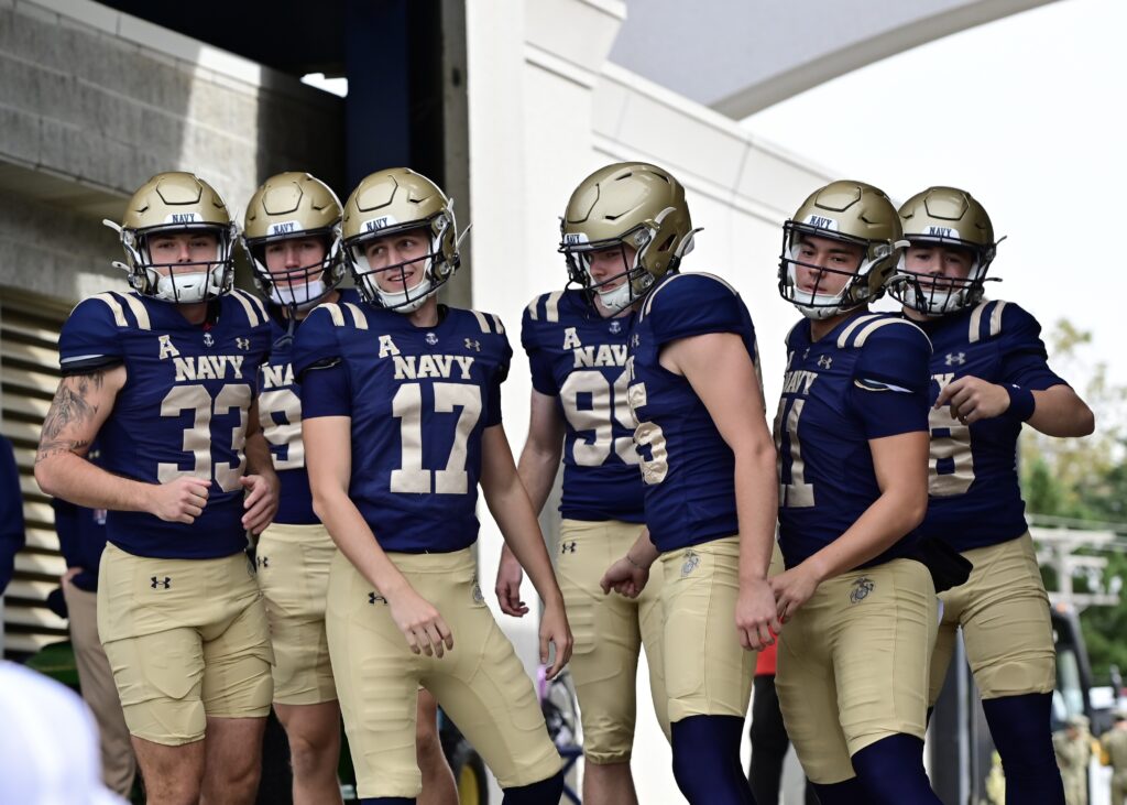 Navy’s specialists head to the field for their warmup.