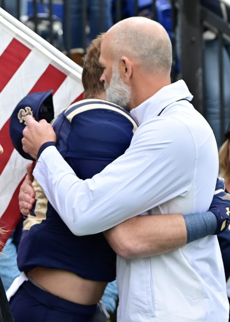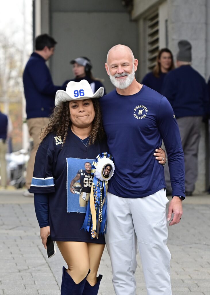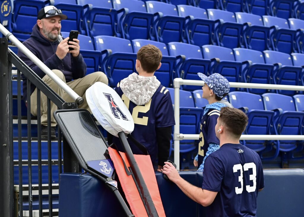 Navy’s Stephen Glenn, #33, poses for photos with a pair of young Navy fans before heading in to get ready for the game.