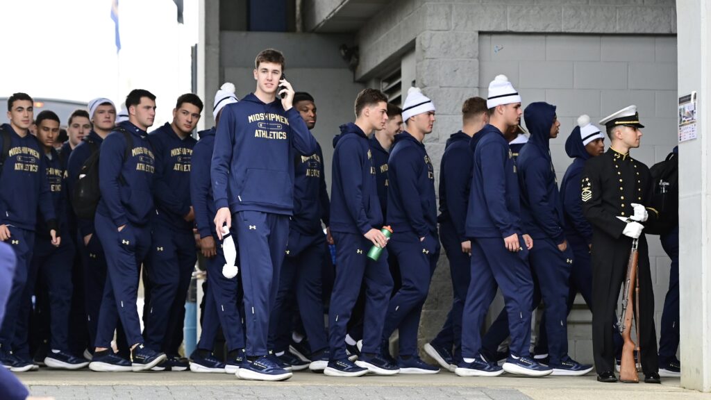 Navy’s JV squad arrives early enough to grab a meal before cheering on their Varsity brothers.