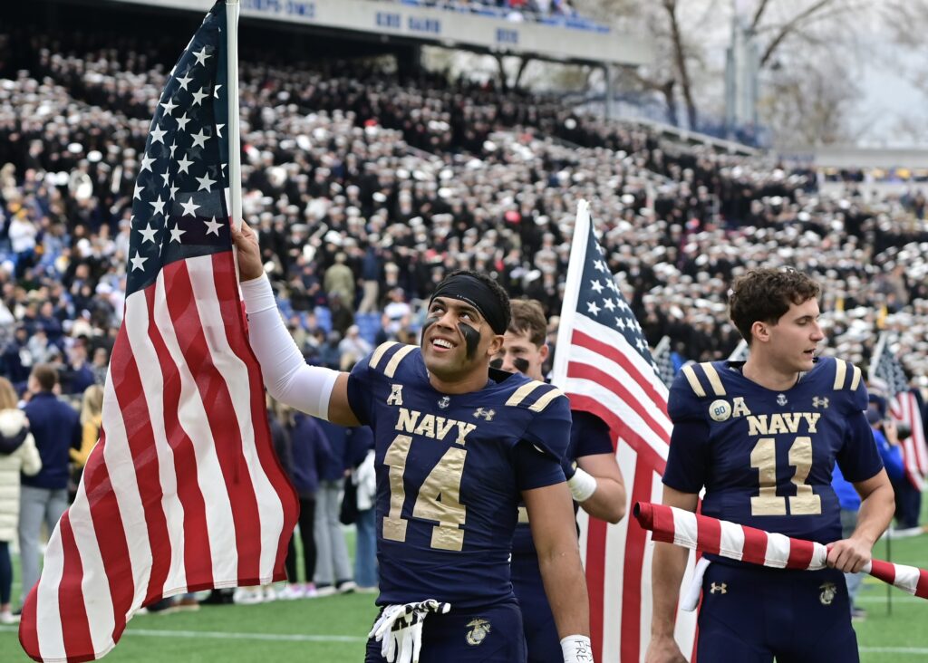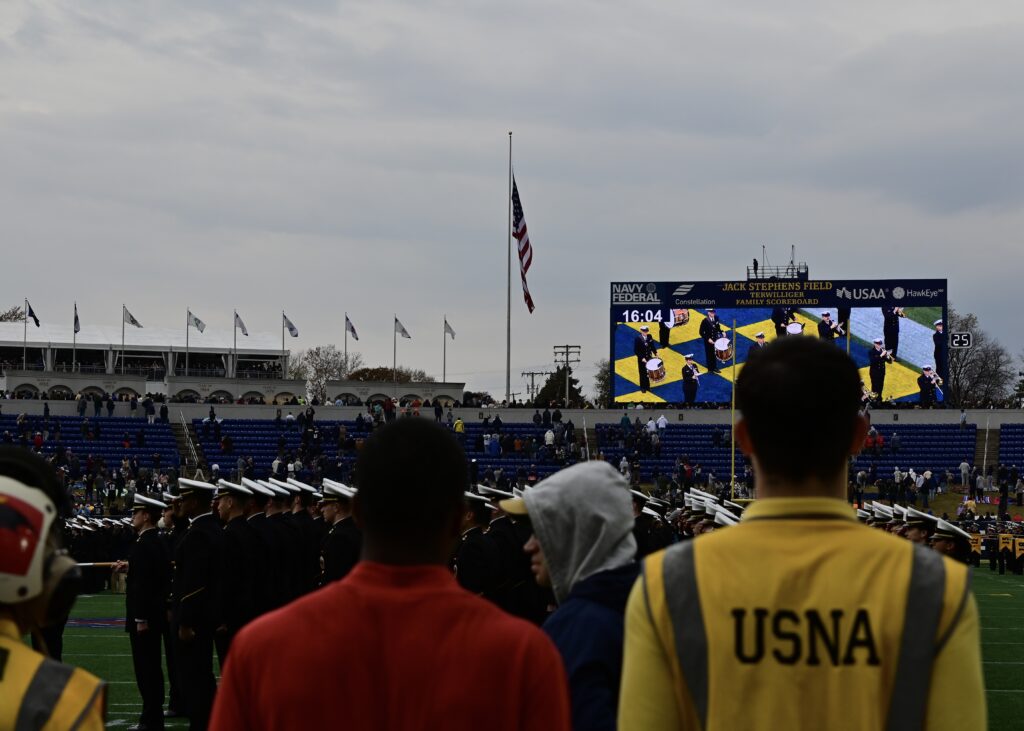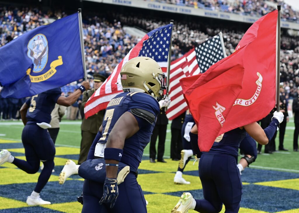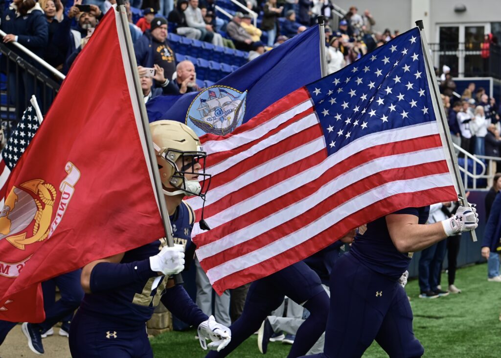 Flag bearers for the day’s game: Griffen Willis (#95) carried the American flag, Giuseppi Sessi (#16) carried the Marine Corps flag, and Braxton Woodson (#5) carried the Navy flag.