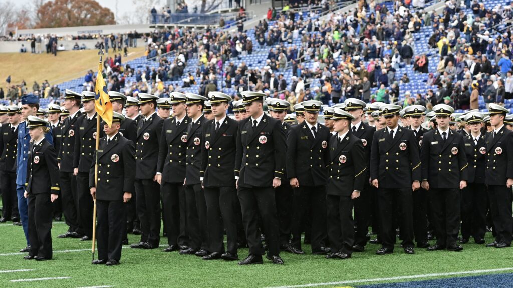 Navy’s mascots, Bill XXXVIII and Mascot-in-training Bill XXXIX, are escorted onto the field ahead of the Brigade of Midshipmen.