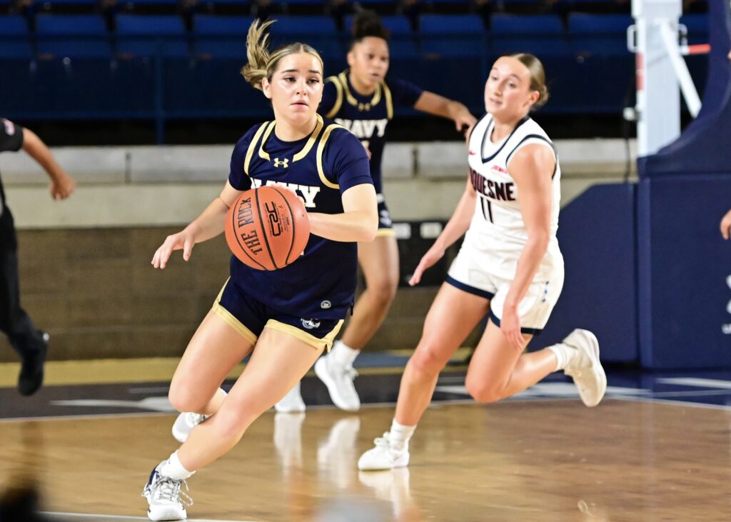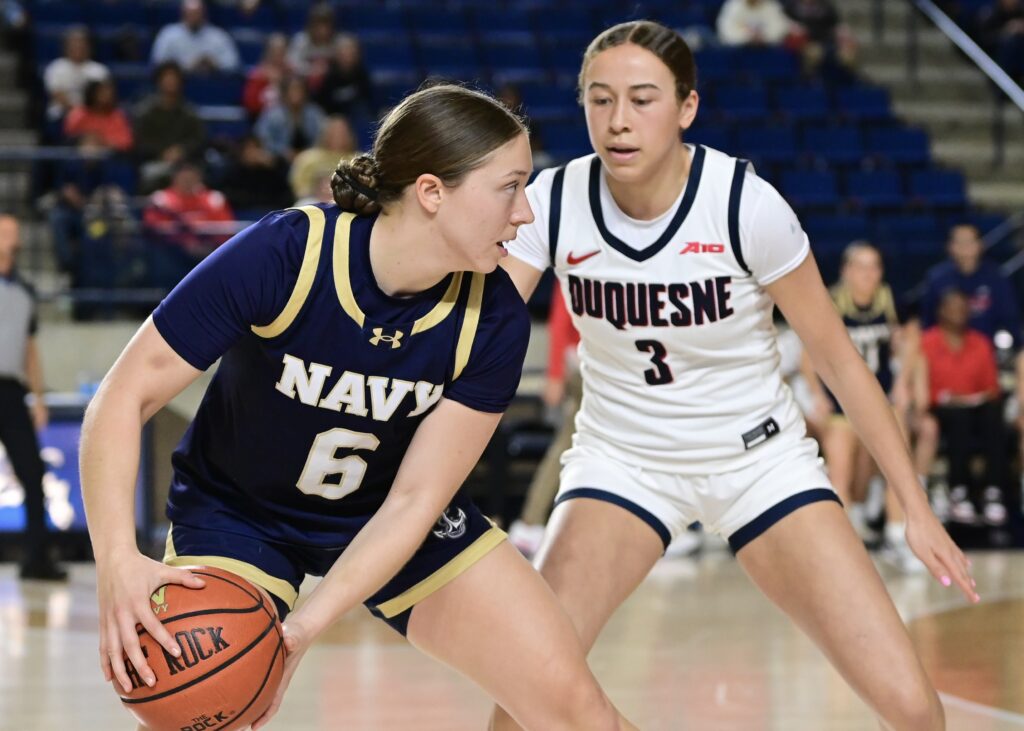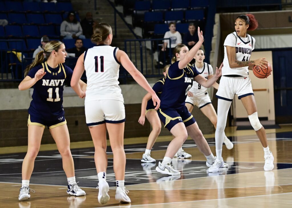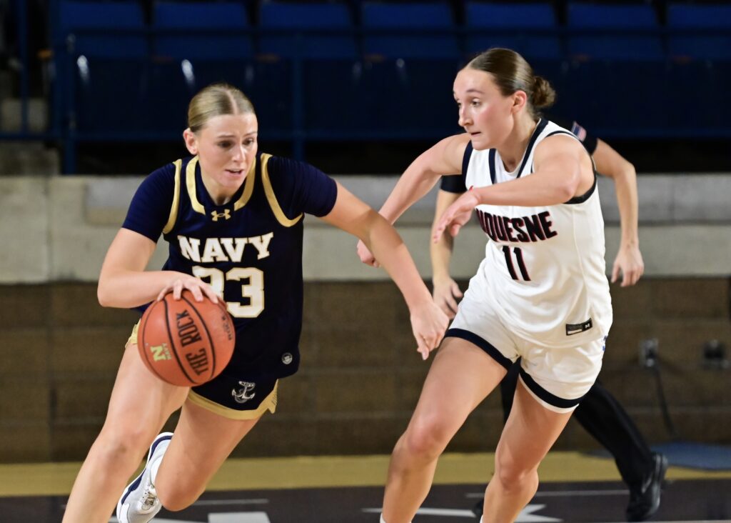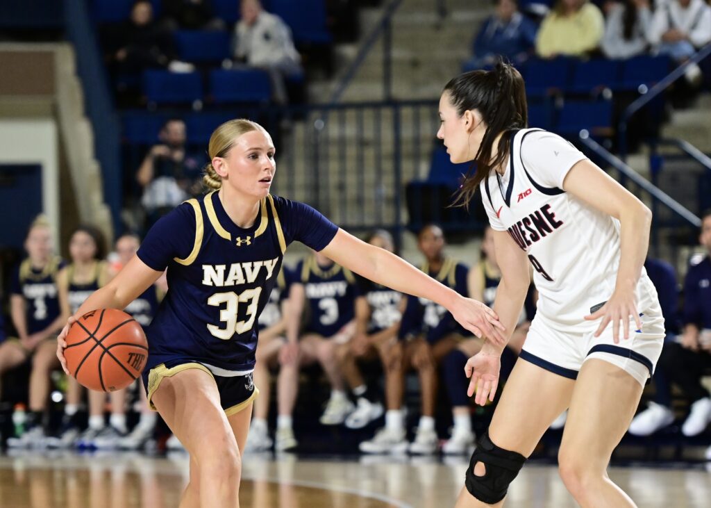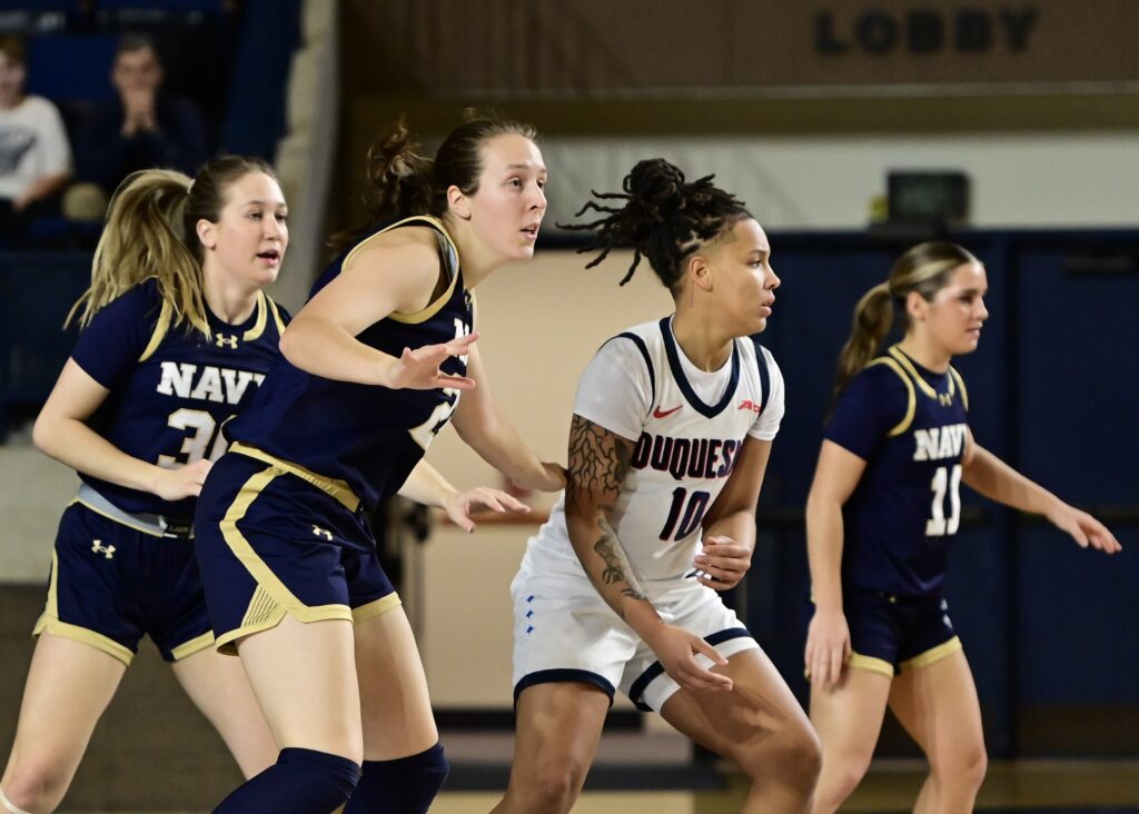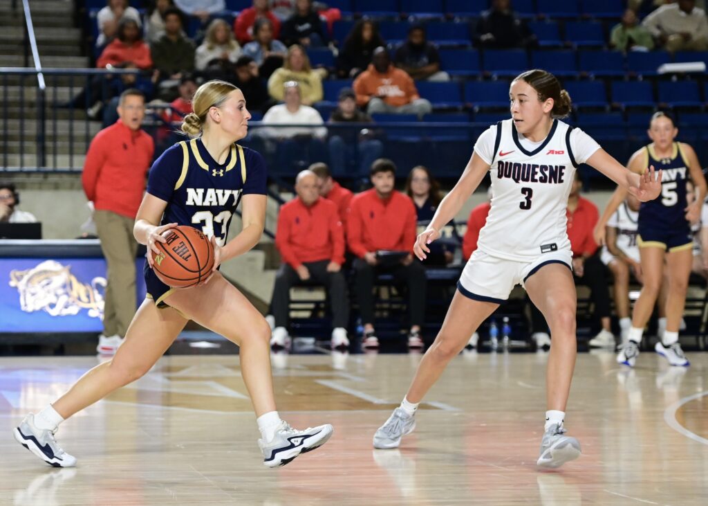 Photos from the first half of the Navy Womens Basketball 69-67 OT loss to Duquesne on Sunday, November 30, 2025, as seen through the lens of staff photographer Alison Althouse.