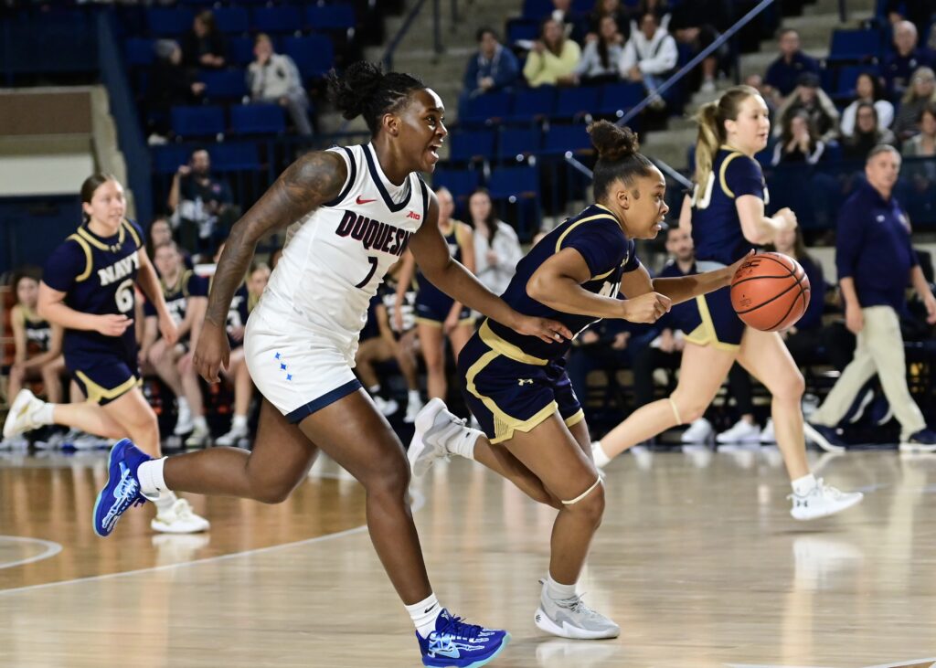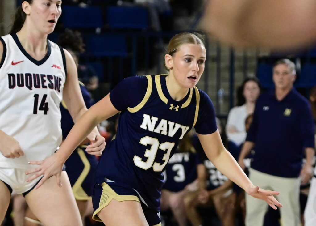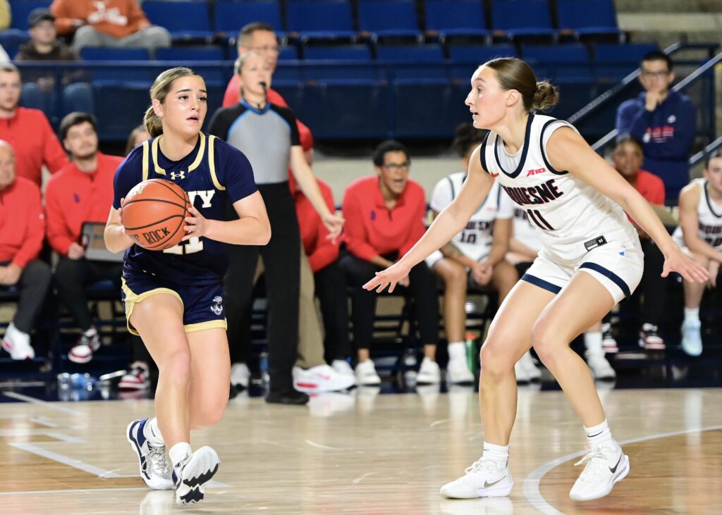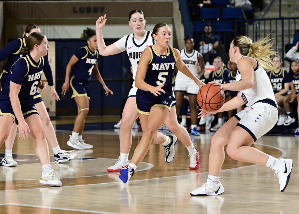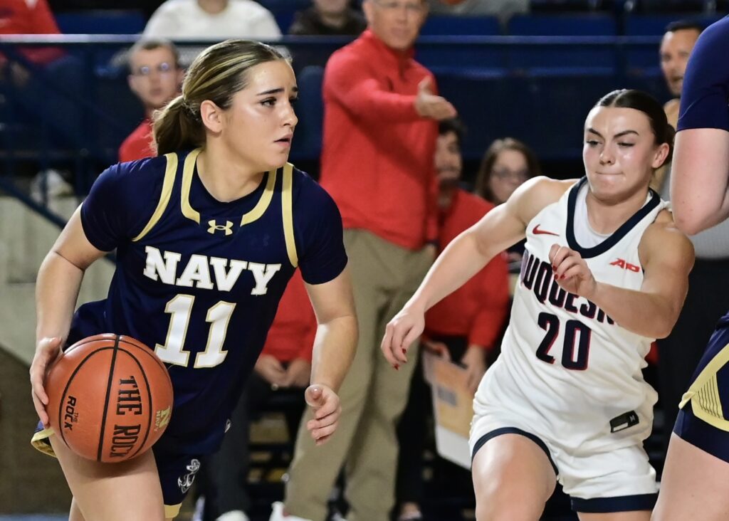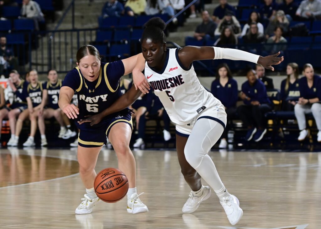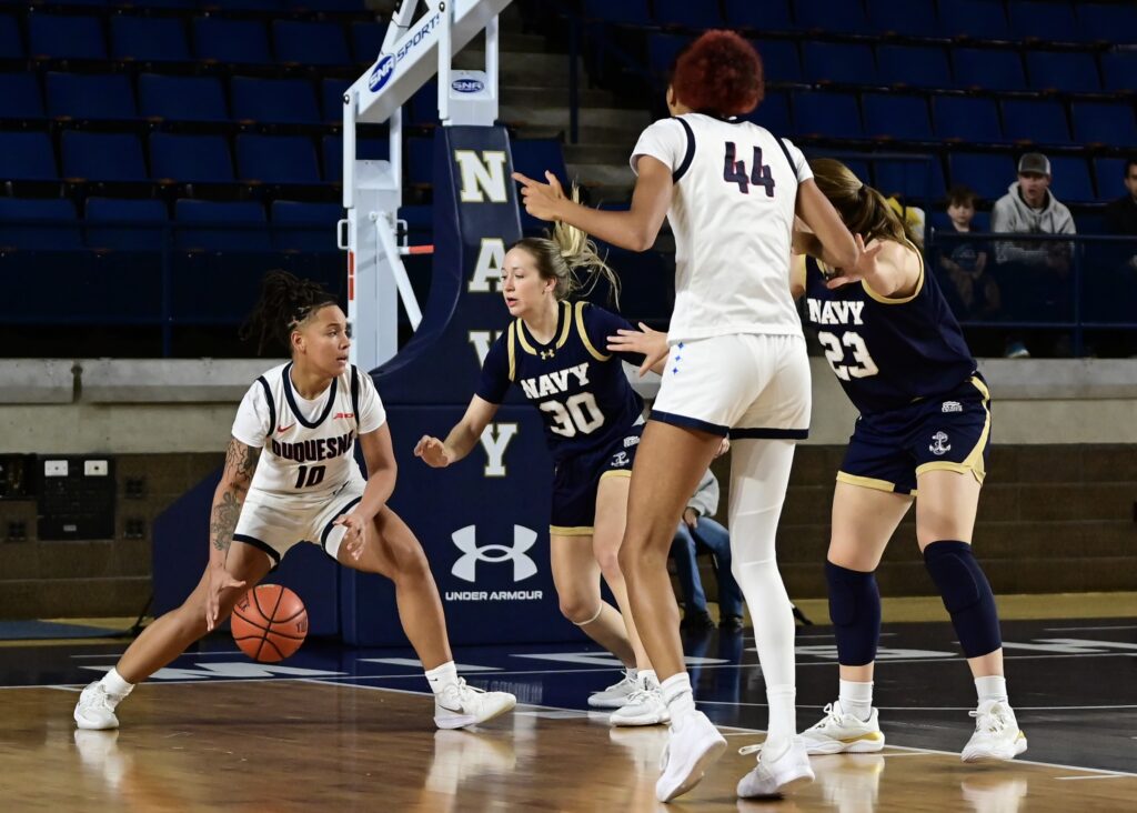Photos from the first half of the Navy Womens Basketball 69-67 OT loss to Duquesne on Sunday, November 30, 2025, as seen through the lens of staff photographer Alison Althouse.