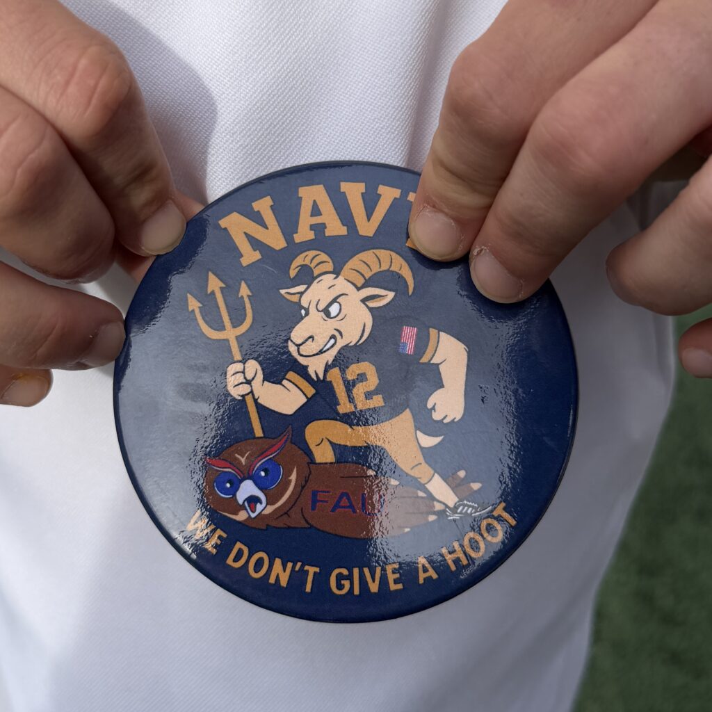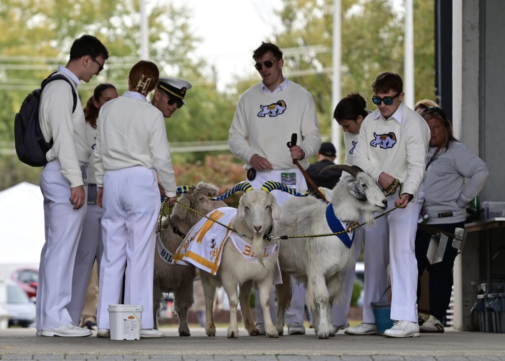 Team Bill accompanies Navy’s mascots to the field: Bill XXXVII, Bill XXXVIII, and Bill-in-training XXXIX.