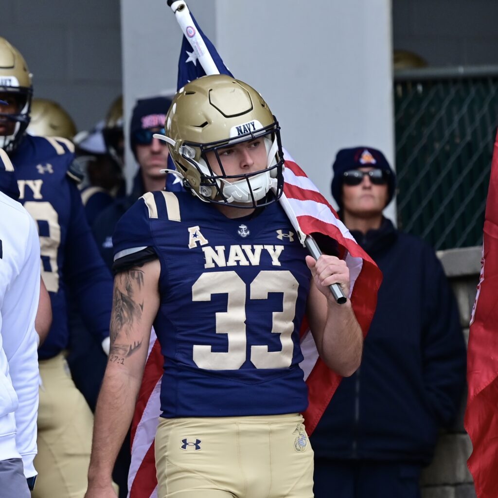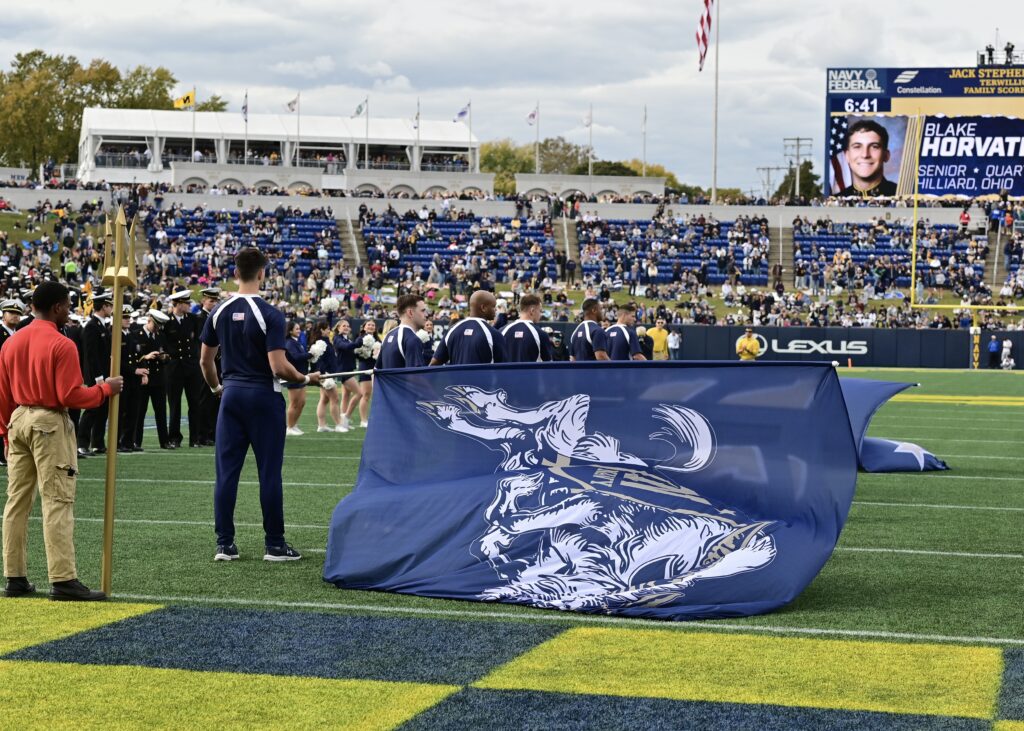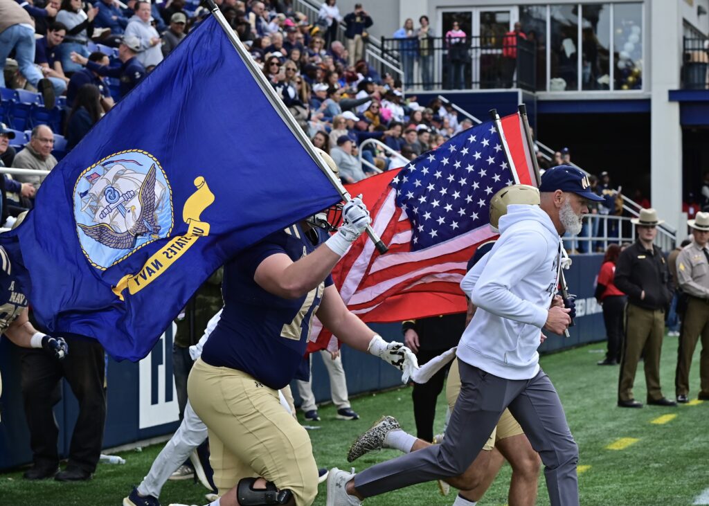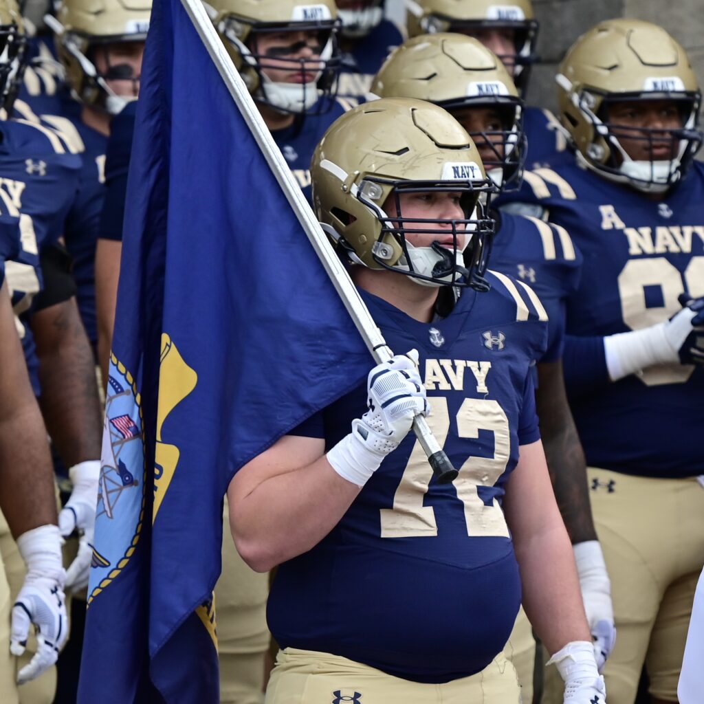 Navy’s Greyson Crawford, #72, carries the Navy flag.