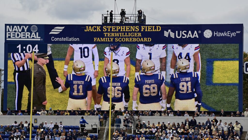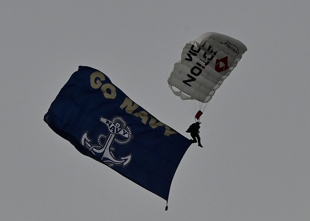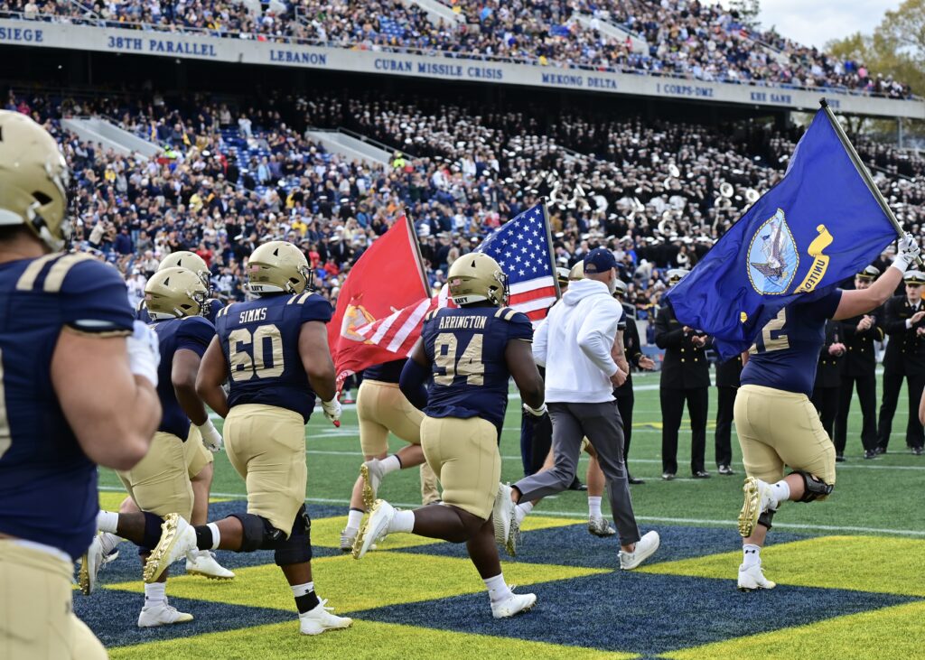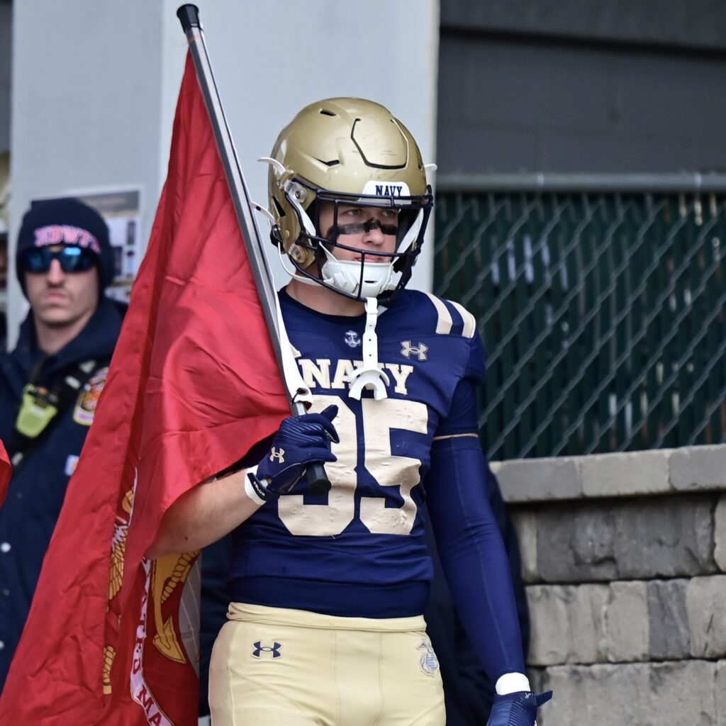 Navy’s Greyson Crawford, #72, carries the Navy flag.
