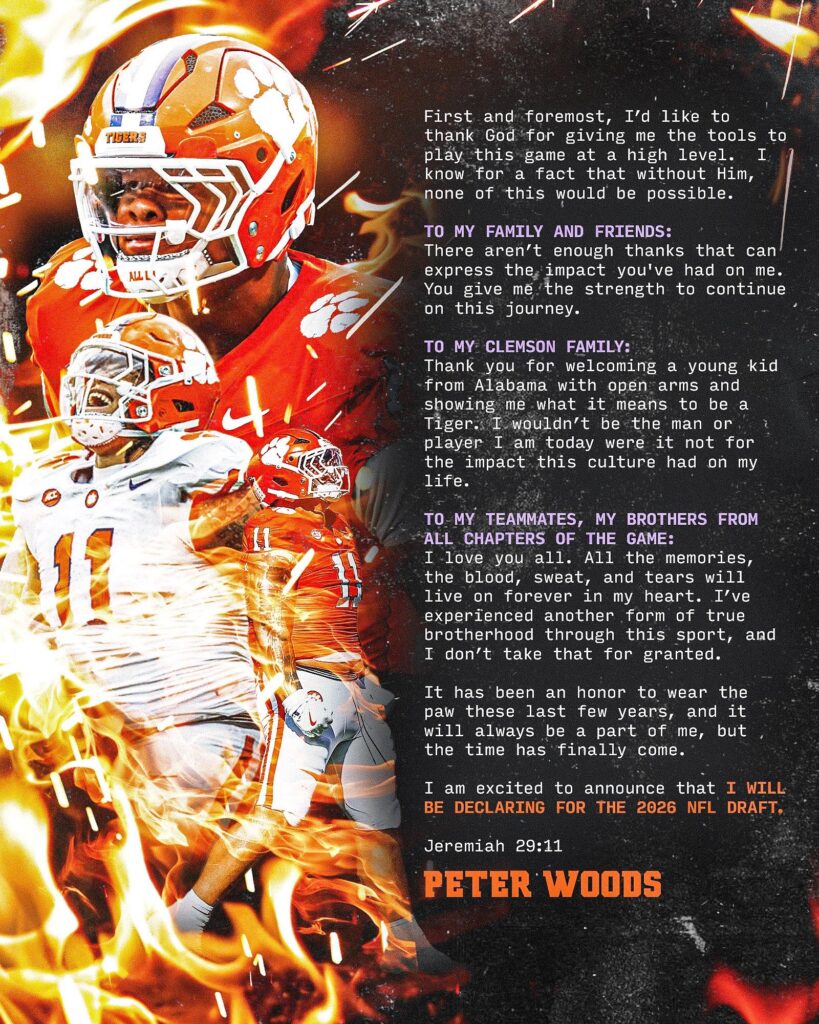 Tuesday, as expected, Clemson junior defensive tackle Peter Woods announced his intentions to enter the 2026 NFL Draft.
