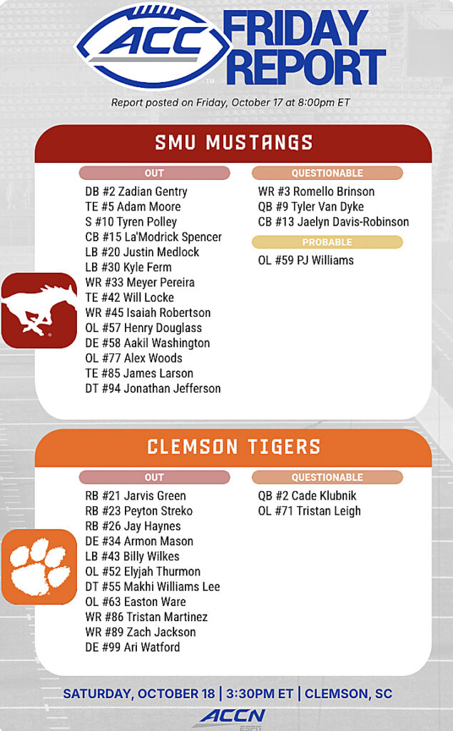 CLEMSON — Friday night Clemson released its second injury report of the week through the Atlantic Coast Conference.