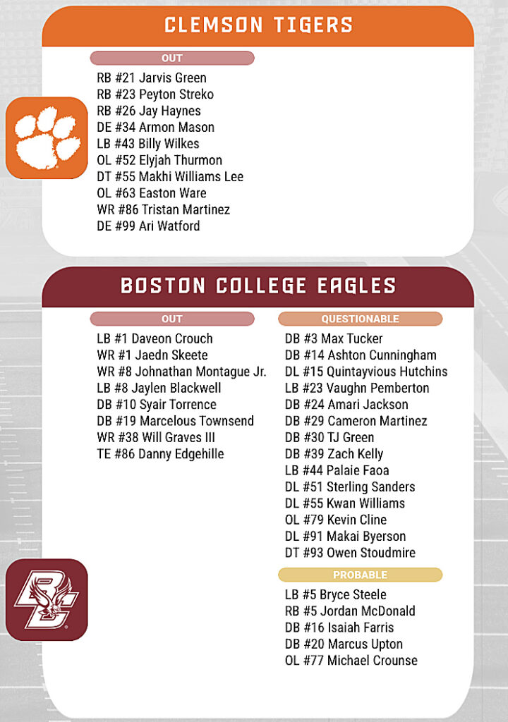 CLEMSON — Thursday night both Clemson and Boston College released their initial injury reports through the Atlantic Coast Conference ahead of Saturday night’s matchup.