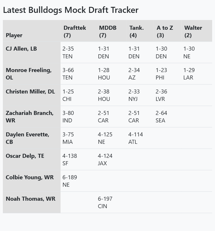 Our five mock drafts projected “only” eight different Bulldog players to get drafted (compared to 15 players in the initial tracker from a year ago), including just two who were unanimously forecasted by the five mocks (mocks’ average overall selection, round): linebacker CJ Allen (31.4, late 1st round) and offensive lineman Monroe Freeling (36.0, early 2nd round).