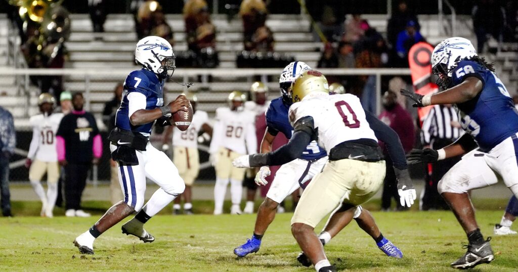 Moments later, Indian River freshman phenom Lord Malik Heru scrambled around and found senior Ryan Robinson all alone about 20 yards behind every King’s Fork defender for an 83-yard touchdown pass. The Braves missed the extra point and trailed 7-6 at the halftime break.