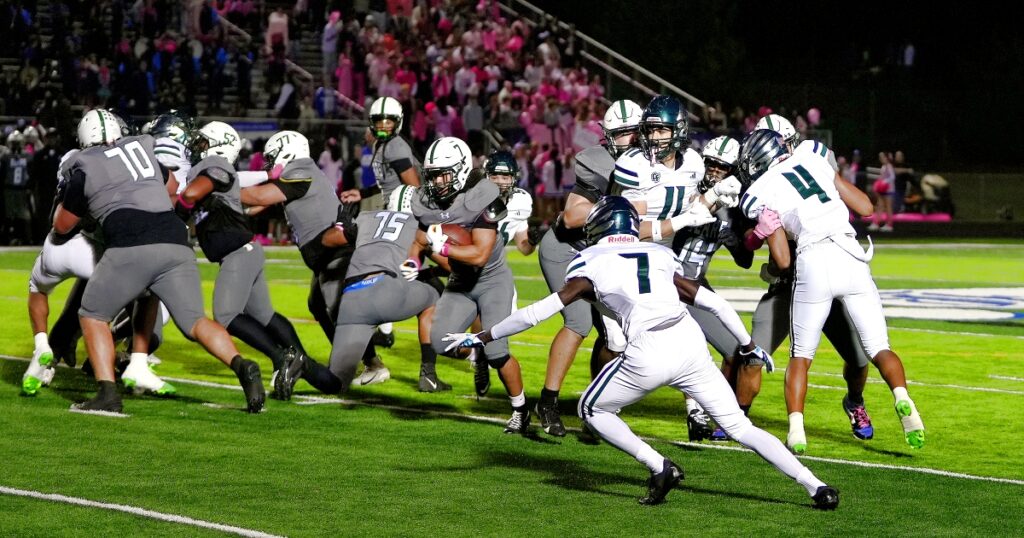 Colonial Forge quarterback Brock Brimhall was able to move the ball when the Eagles’ offense was on the field. He completed 18 of 23 passes for 204 yards and three touchdown passes while gaining 42 yards on the ground. Brimhall connected with Old Dominion commit Taysean Jones, who caught five passes for 63 yards.