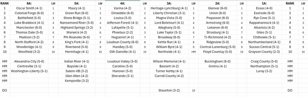 It’s rare for the Class 6 and Class 5 Top Tens to stay completely the same from the prior week, unchanged, but that’s the case. In fact, only one team fell out of any of the Top Ten rankings completely and that was Staunton in Class 3 by virtue of their 13-7 loss to the Little Giants of Waynesboro. Jumping in was Northside, which beat Class 1 contender Rappahannock 18-7 and now plays host to William Byrd (4-1) in a key Region 3D matchup.