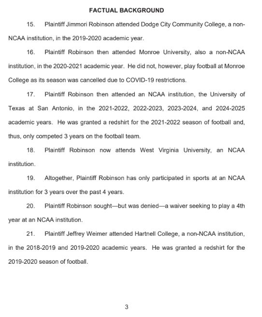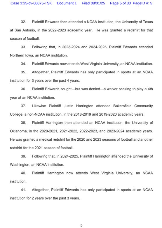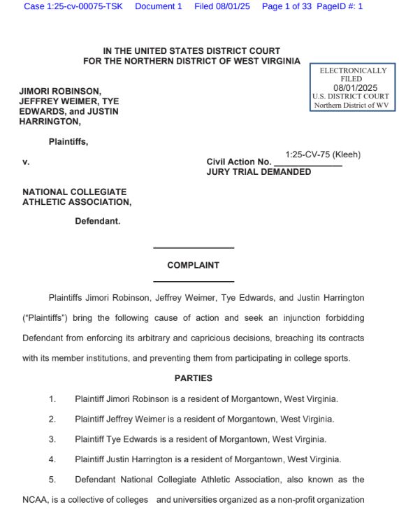 The plaintiffs: Jimmori Robinson, Jeffrey Weimer, Tye Edwards, and Justin Harrington, all transferred to WVU this spring and have been waiting on waivers for fall eligibility. With no rulings yet, the group is now taking legal action.