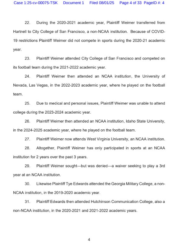 Their complaint, filed August 1, goes well beyond typical eligibility arguments. It asserts that the NCAA is violating antitrust law by penalizing athletes who begin their careers at junior colleges or other non-NCAA schools, a set of rules the suit refers to as the “JUCO Penalty.”