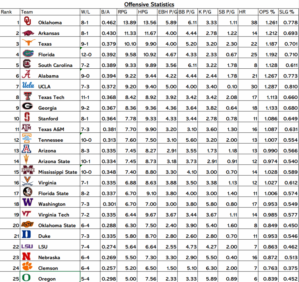 At the top, Oklahoma remains the gold standard offensively. The Sooners lead the field with a staggering .462 team batting average and a nation‑best 38 home runs, pairing elite contact with consistent power. Leading the way is Gabbie Garcia with seven home runs and Kasidi Pickering with five of her own. Moreover, their ability to score while maintaining discipline reflects an offense that applies constant pressure without relying solely on the long ball. As a result, Oklahoma continues to set the benchmark for offensive efficiency.
