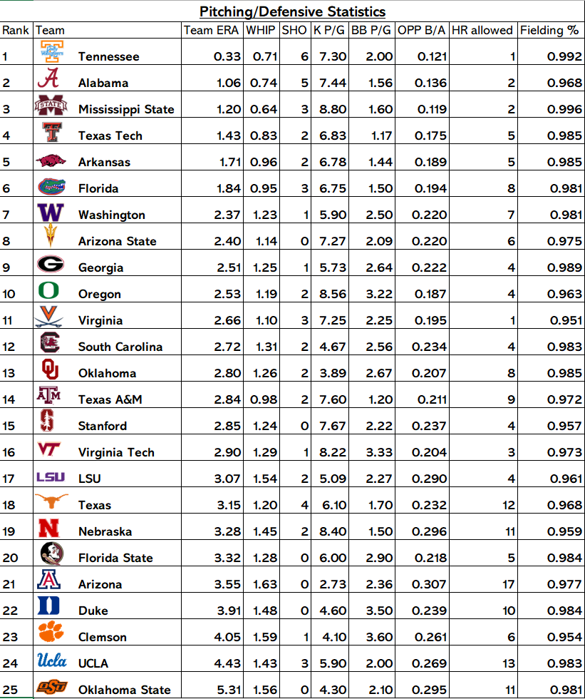 Transitioning slightly downward, Texas Tech, Arkansas, and Florida continue to show strong balance. Texas Tech’s low ERA (1.43) and disciplined approach to limiting walks suggest a staff that thrives on command. Arkansas remains consistent across categories, while Florida’s placement reflects depth and reliability, even if its numbers are marginally less dominant than the top tier. In each case, these teams remain difficult to score against because they avoid extended innings and self‑inflicted damage.