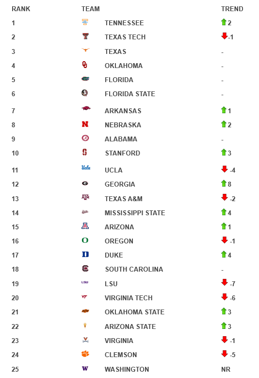 There is a new No. 1 this week. Tennessee continued its red‑hot start to the season with a dominant showing at the Clearwater Invitational. The Lady Vols’ consistent execution and depth across the lineup left little doubt about their place at the top of the rankings.