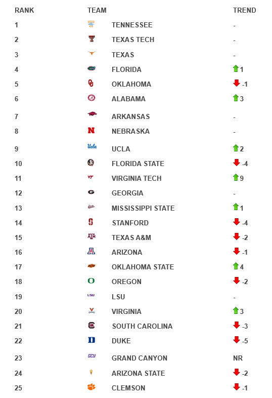 The top of the rankings remained unchanged this week, as Tennessee, Texas Tech, and Texas held firm in the No. 1–3 positions following undefeated performances. However, there was movement just behind them, with Oklahoma and Florida swapping spots after the Sooners suffered a surprising upset loss to Long Beach State.