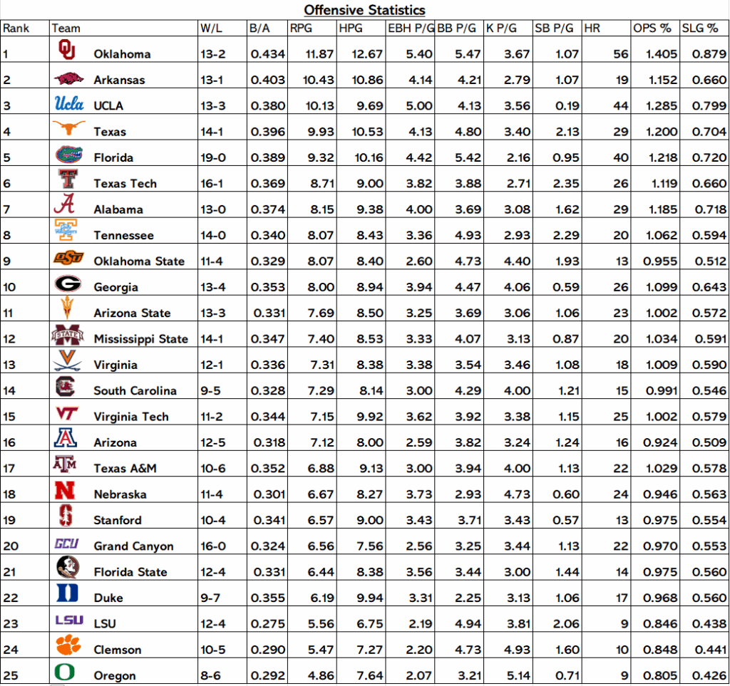 Oklahoma’s offensive profile remains the gold standard. A nation‑leading .434 team batting average, paired with elite OPS (1.405) and slugging (.879), underscores a lineup that blends contact, power, and discipline at an unmatched level. The Sooners also average 11.87 runs per game while posting strong walk production and manageable strikeout rates, highlighting an offense that does not rely on chasing big innings—it creates them consistently.