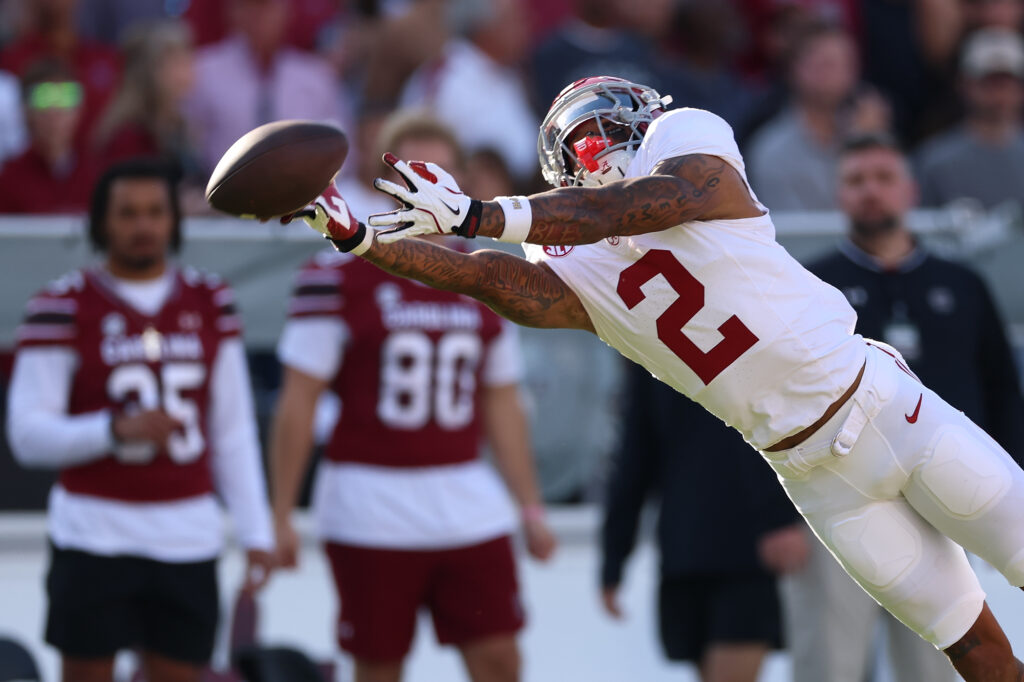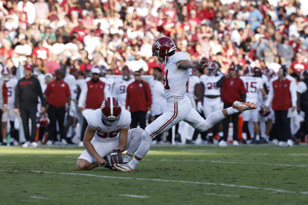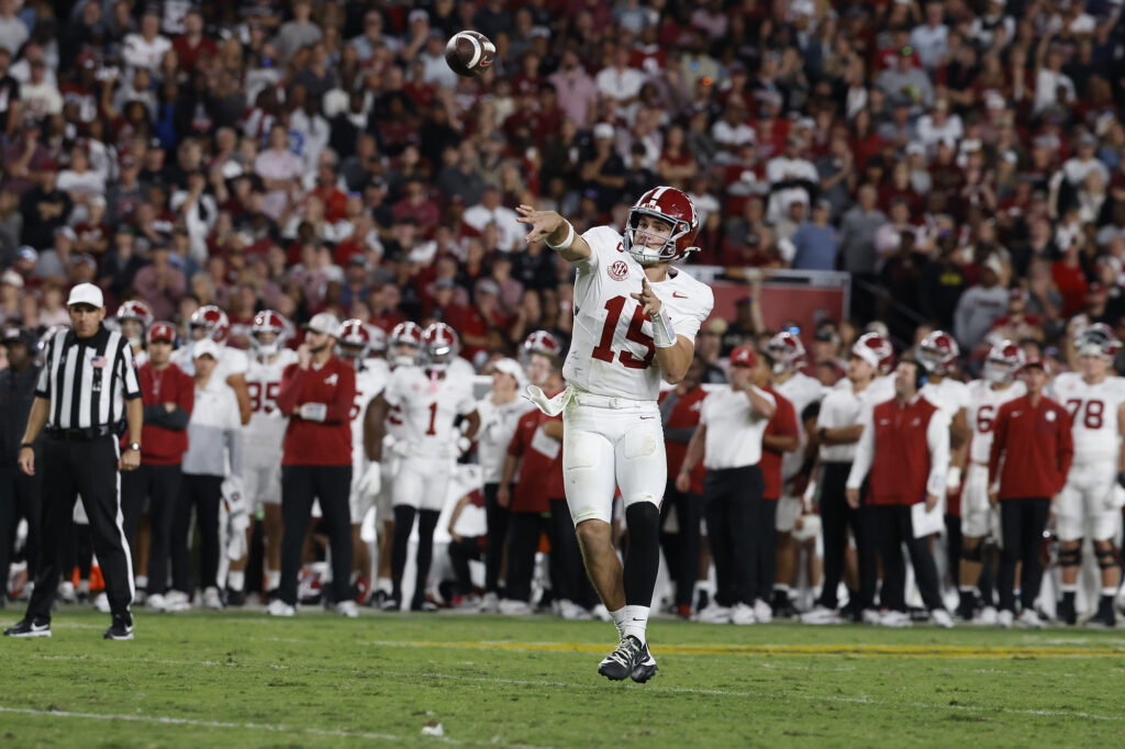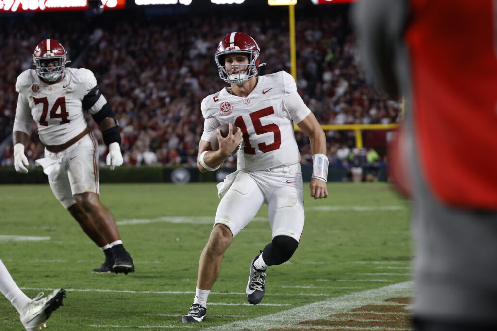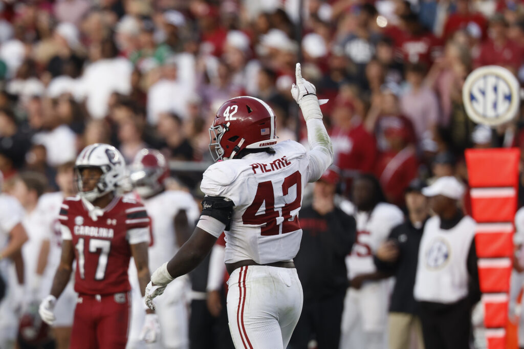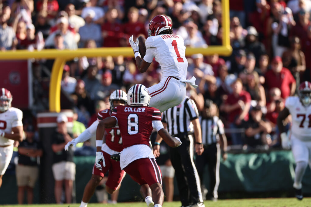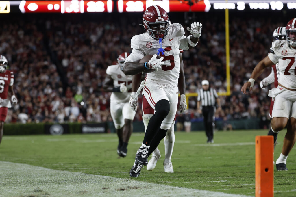 Alabama Wide Receiver Germie Bernard (5) runs for a touchdown against South Carolina at Williams-Brice Stadium in Columbia, SC on Saturday, Oct 25, 2025.Alabama Wide Receiver Ryan Williams (2) reaches for the ball against South Carolina at Williams-Brice Stadium in Columbia, SC on Saturday, Oct 25, 2025.Alabama Kicker Conor Talty (31) kicks the ball against South Carolina at Williams-Brice Stadium in Columbia, SC on Saturday, Oct 25, 2025.Alabama Defensive Lineman James Smith (23) lines up on defense against South Carolina at Williams-Brice Stadium in Columbia, SC on Saturday, Oct 25, 2025.Alabama Quarterback Ty Simpson (15) runs the ball against South Carolina at Williams-Brice Stadium in Columbia, SC on Saturday, Oct 25, 2025.Quarterback Ty Simpson (15) throws the ball against South Carolina at Williams-Brice Stadium in Columbia, SC on Saturday, Oct 25, 2025.Linebacker Yhonzae Pierre (42) celebrates against South Carolina at Williams-Brice Stadium in Columbia, SC on Saturday, Oct 25, 2025.Running Back Jam Miller (26) looks to score a touch down against South Carolina at Williams-Brice Stadium in Columbia, SC on Saturday, Oct 25, 2025.Defensive Back DaShawn Jones (7) makes a touchdown on a pick six against South Carolina at Williams-Brice Stadium in Columbia, SC on Saturday, Oct 25, 2025.Wide Receiver Isaiah Horton (1) catches the ball against South Carolina at Williams-Brice Stadium in Columbia, SC on Saturday, Oct 25, 2025.Wide Receiver Germie Bernard (5) scores a touch down against South Carolina at Williams-Brice Stadium in Columbia, SC on Saturday, Oct 25, 2025.