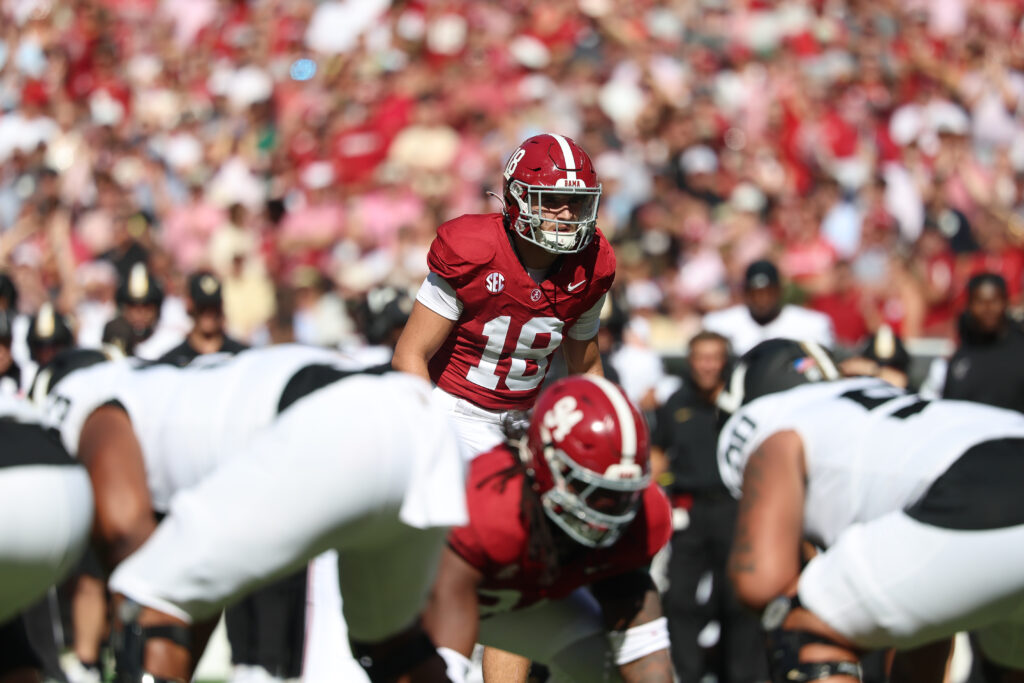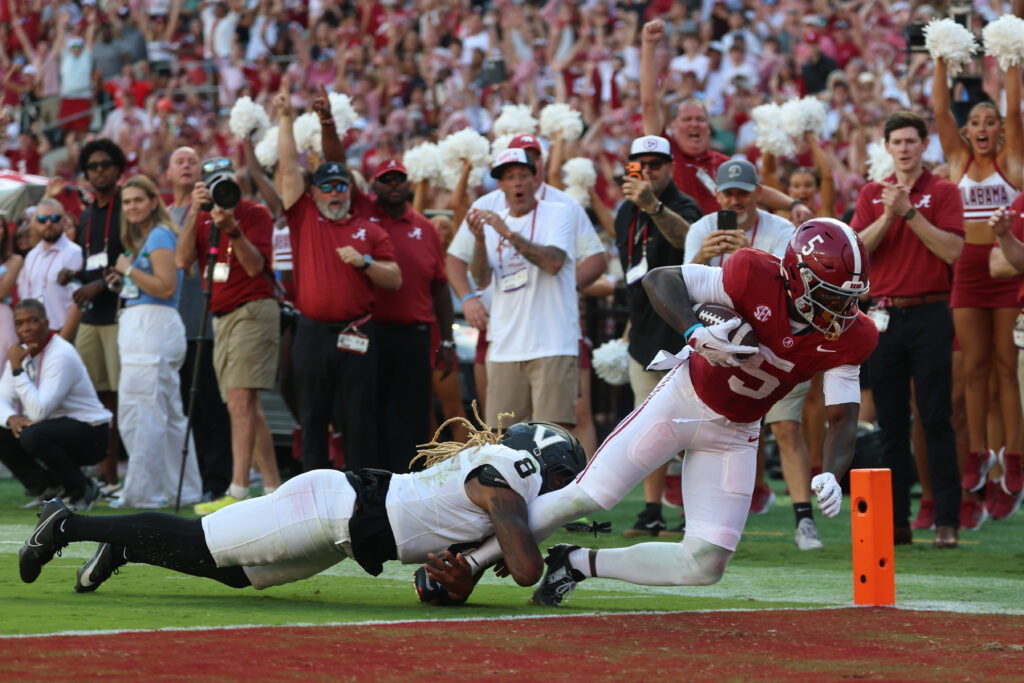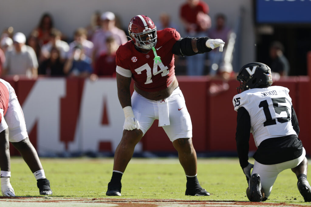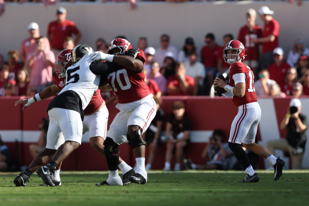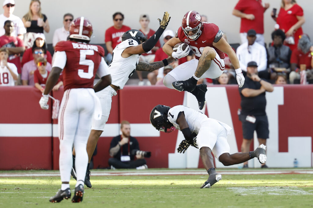 Alabama Tight End Josh Cuevas (80) hurdles against Vanderbilt at Bryant-Denny Stadium in Tuscaloosa, AL on Saturday, Oct 4, 2025.Alabama Quarterback Ty Simpson (15) looks for a receiver against Vanderbilt at Bryant-Denny Stadium in Tuscaloosa, AL on Saturday, Oct 4, 2025.Alabama Defensive Back Bray Hubbard (18) in action against Vanderbilt at Bryant-Denny Stadium in Tuscaloosa, AL on Saturday, Oct 4, 2025.Alabama Kicker Conor Talty (31) lines up kick against Vanderbilt at Bryant-Denny Stadium in Tuscaloosa, AL on Saturday, Oct 4, 2025.Offensive Lineman Kadyn Proctor (74) in action against Vanderbilt at Bryant-Denny Stadium in Tuscaloosa, AL on Saturday, Oct 4, 2025.Running Back Jam Miller (26) runs the ball against Vanderbilt at Bryant-Denny Stadium in Tuscaloosa, AL on Saturday, Oct 4, 2025.Wide Receiver Germie Bernard (5) scores a touchdown against Vanderbilt at Bryant-Denny Stadium in Tuscaloosa, AL on Saturday, Oct 4, 2025.Wide Receiver Rico Scott (11) catches the ball against Vanderbilt at Bryant-Denny Stadium in Tuscaloosa, AL on Saturday, Oct 4, 2025.Wide Receiver Isaiah Horton (1) catches the ball against Vanderbilt at Bryant-Denny Stadium in Tuscaloosa, AL on Saturday, Oct 4, 2025.